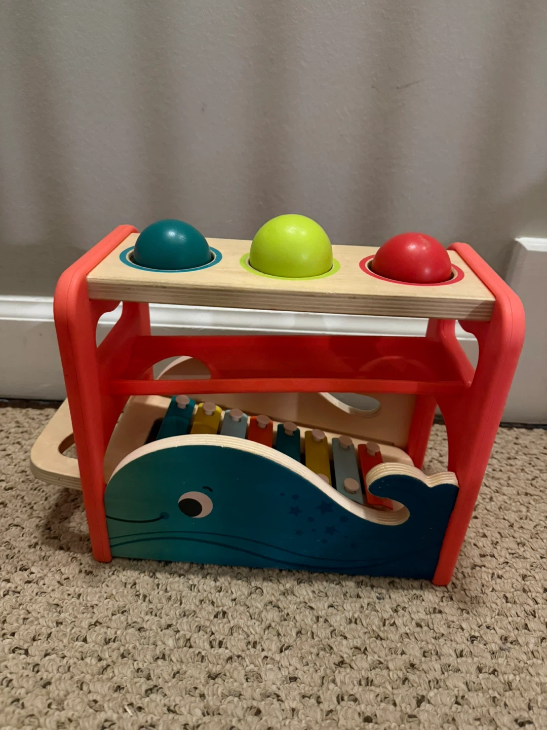 This wooden toy features three colorful balls to pound and a built-in xylophone. It includes a whale design with a colorful musical scale.