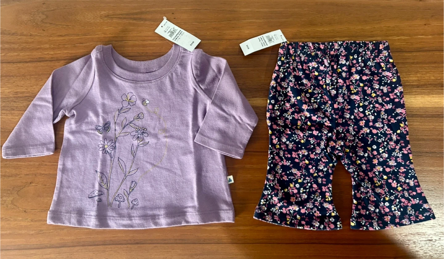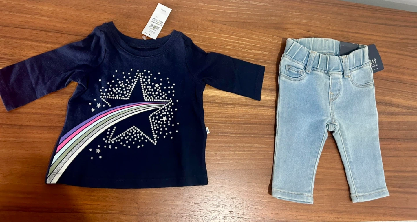• Navy top with star design + “My First Jeggings” (denim look, soft and comfy)