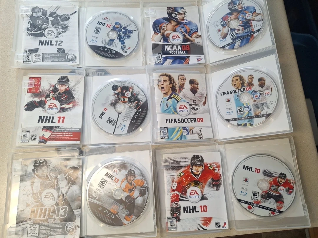 Bundle of EA Sports NHL games, including NHL 12, NHL 11, NHL 10, NHL 13, and NHL 09 disc. Also includes FIFA Soccer 09 and NCAA 08 Football disc. All discs are for PlayStation 3.
