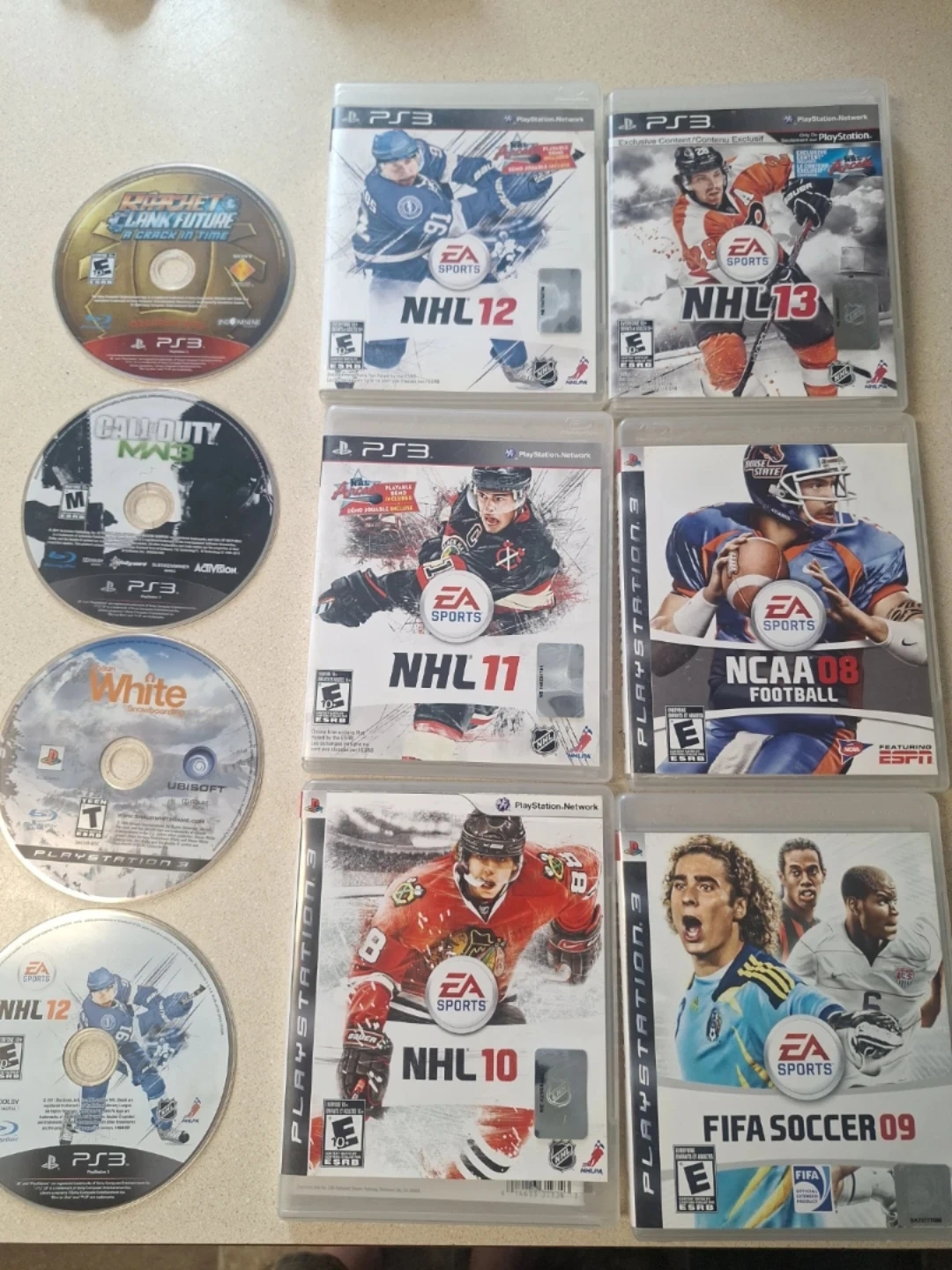 Bundle of EA Sports NHL games, including NHL 12, NHL 11, NHL 10, NHL 13, and NHL 09 disc. Also includes FIFA Soccer 09 and NCAA 08 Football disc. All discs are for PlayStation 3.