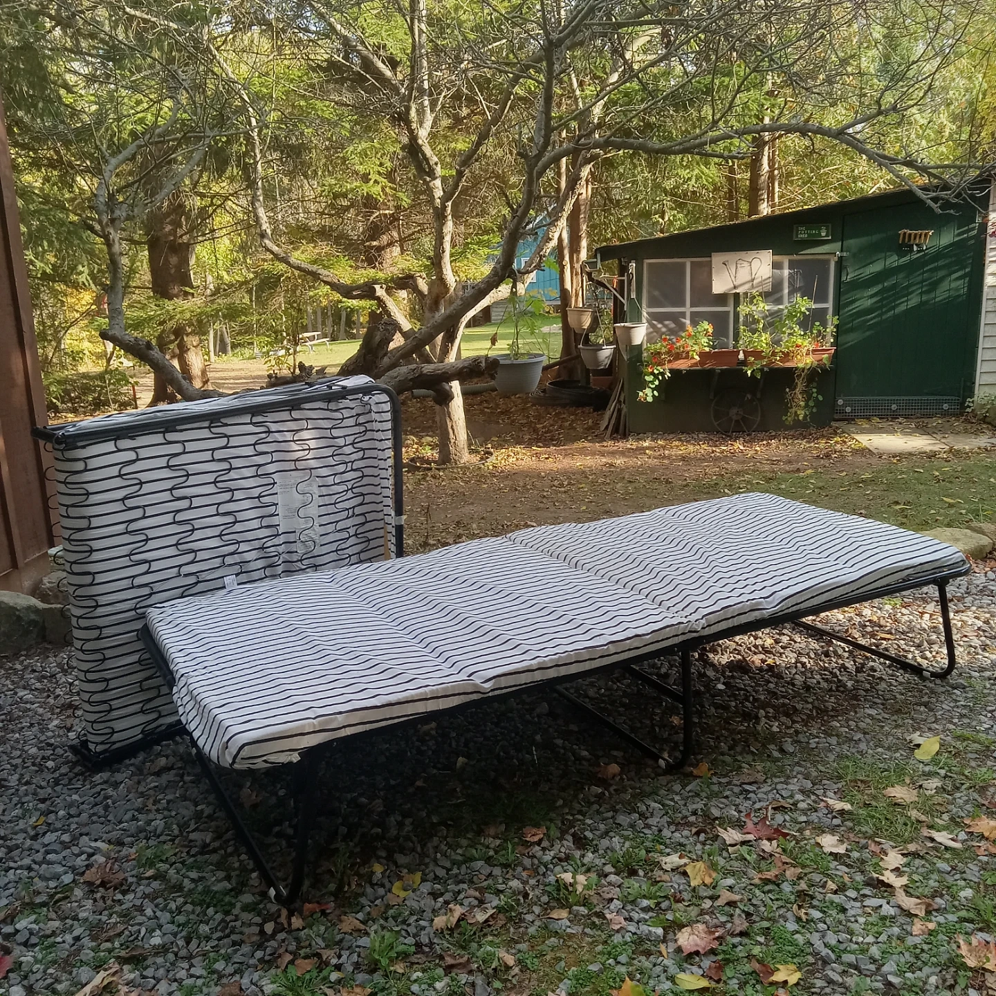 This is a folding cot with a black and white striped mattress. The frame is black metal. It's easy to set up and fold away for storage. Perfect for guests or camping trips!