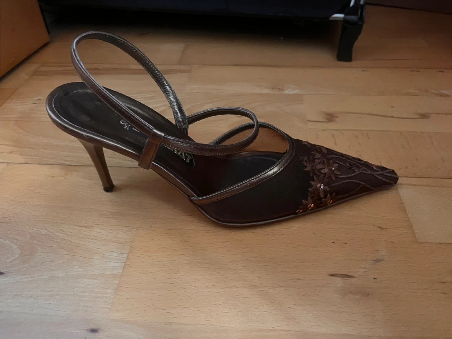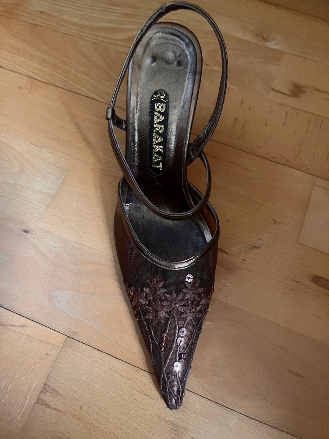 These elegant Barakat women's heels are a lovely bronze colour. They feature intricate detailing with sequins on the toe box and a delicate slingback strap. The pointed toe adds a sophisticated touch.