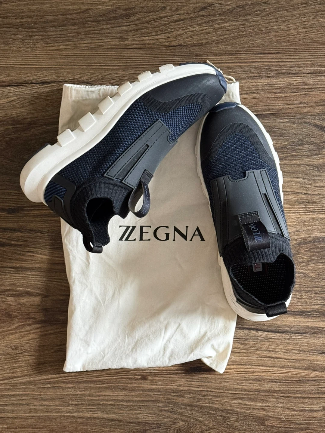 New Zegna Techmerino sneakers in navy blue. Includes original dust bag. Made with premium Techmerino wool for breathability and comfort. Size is 7 US / 8 EU.