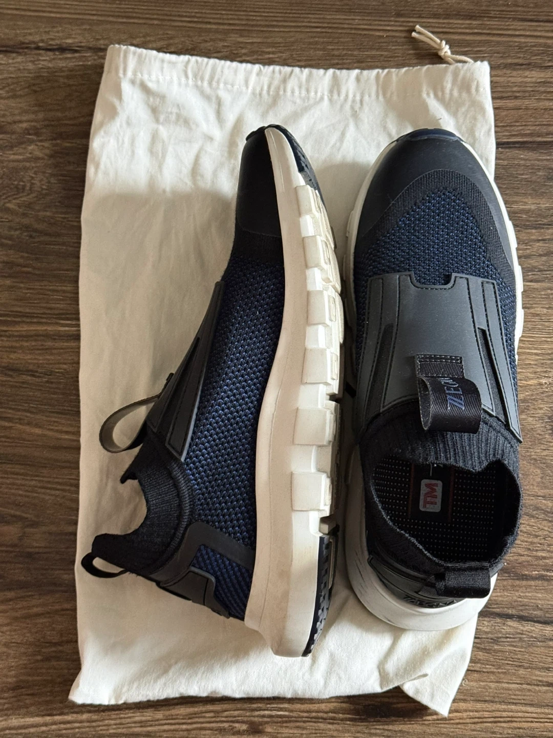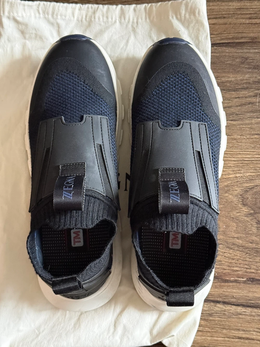 New Zegna Techmerino sneakers in navy blue. Includes original dust bag. Made with premium Techmerino wool for breathability and comfort. Size is 7 US / 8 EU.