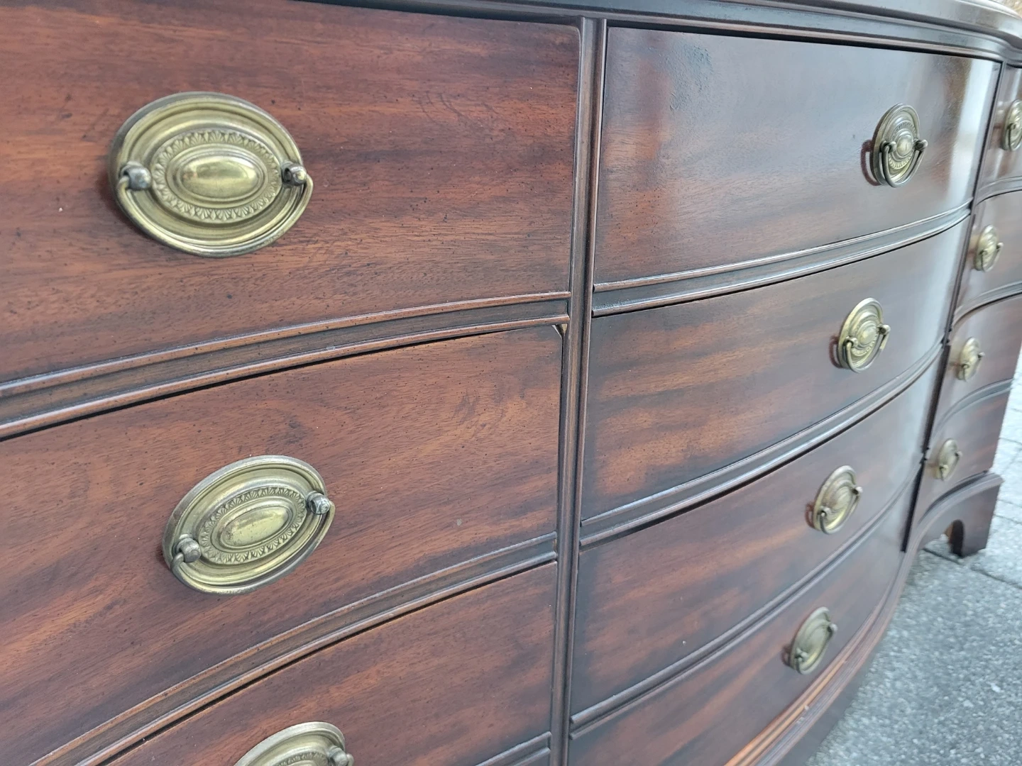 Up for sale is a stunning vintage mahogany dresser / sideboard featuring a classic serpentine (curved) front. This piece is solid, well-crafted, and offers a massive amount of storage with smooth-sliding drawers.