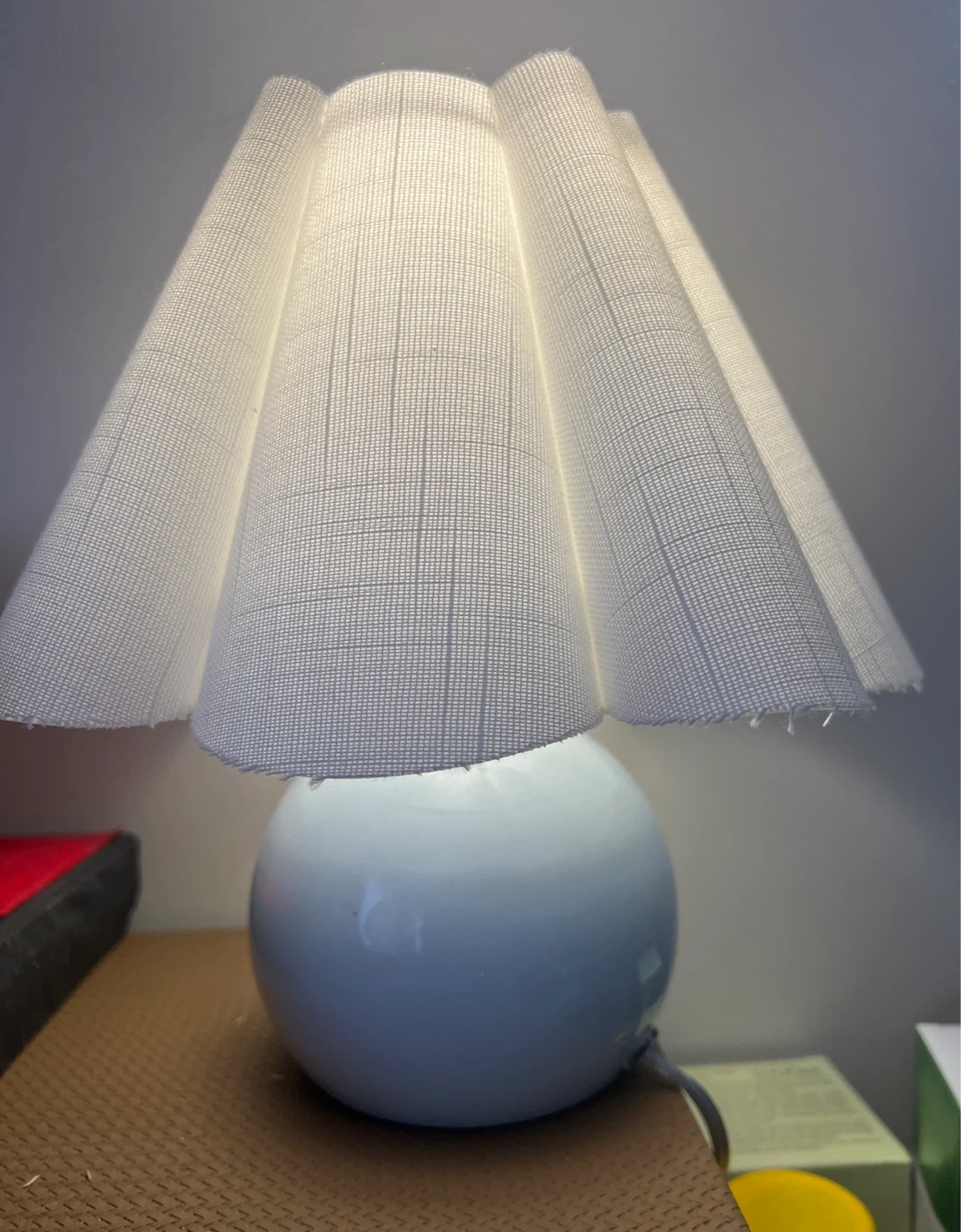 This table lamp has a white, globe-shaped base and a pleated fabric shade. It's perfect for adding a soft light to any room. Just touch to turn on.