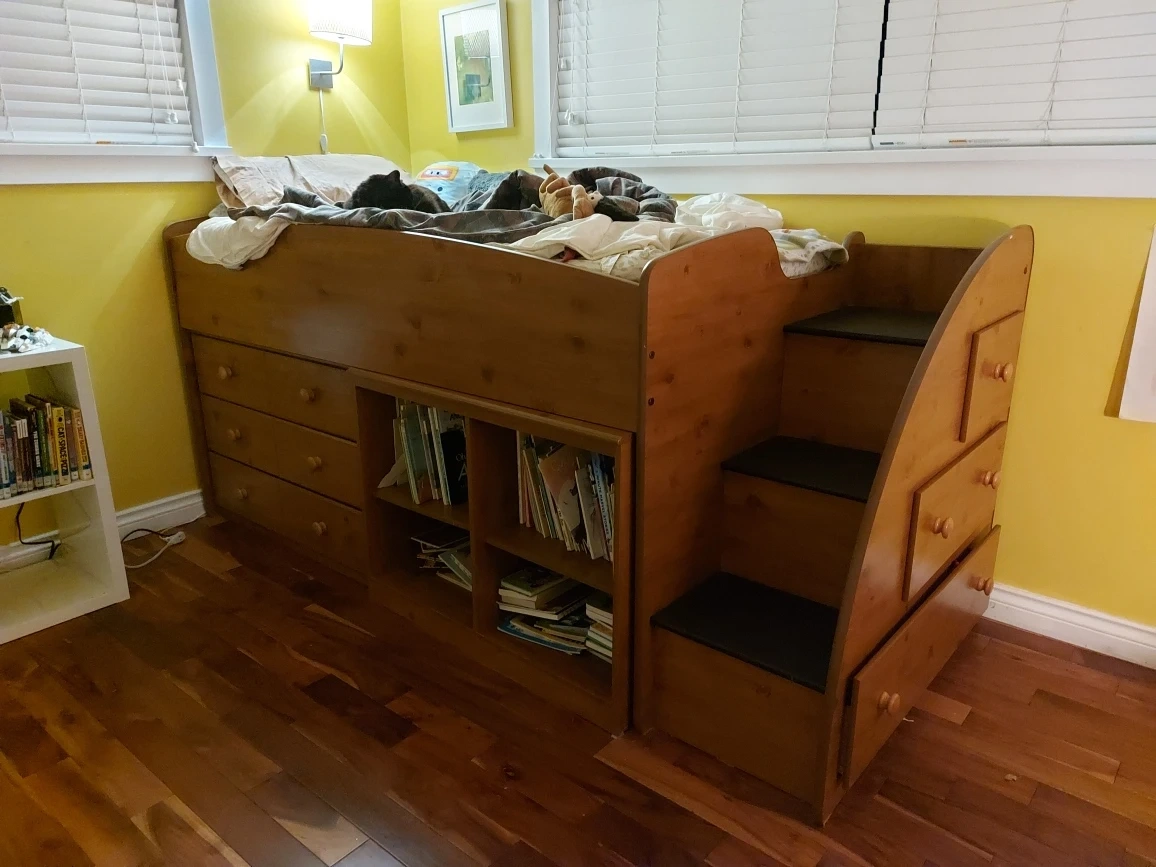 Twin loft bed with drawers and bookshelves. All drawers work, the drawer/bookshelf unit are separate from the frame and can be pulled out to gain access under the bed. Perfect for kids and small rooms. Excellent condition. Cat not included. 😊 Pick up only.