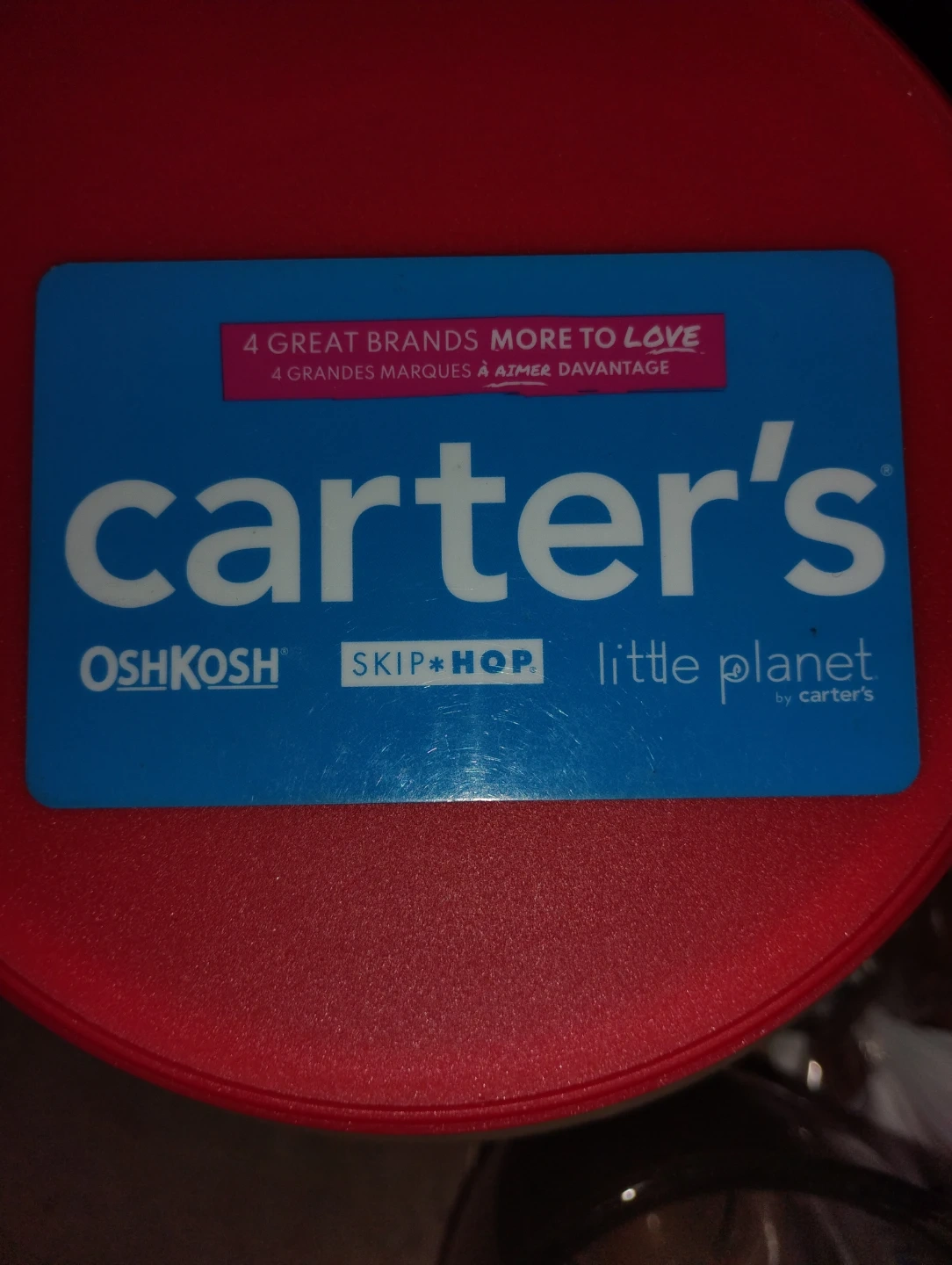 A gift card for Carter's, featuring OshKosh, Skip Hop, and Little Planet. This card offers access to "4 Great Brands, More to Love". SELL FOR $50 BUT ACTUALLY HAS $67 total is verifiable after you make a silly acct but it takes seconds and bam $67 okay maybe 65 I think $67