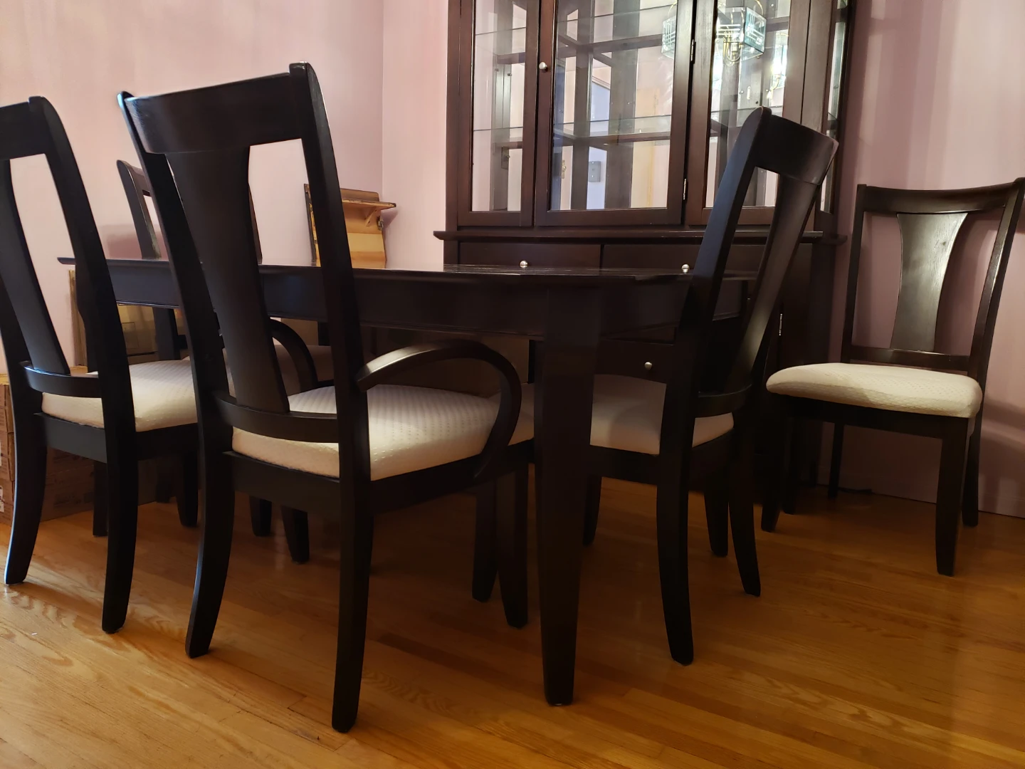 Selling a dining room table with chairs. The set features a dark wood finish and cream-coloured seat cushions. Perfect for a dining room or kitchen space! 6 chairs table 42" X 64-82". China cabinet 56X82