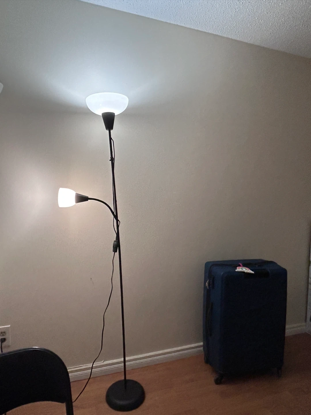 A black floor lamp with two adjustable heads. It provides both ambient and task lighting. Great for a living room or office space!
