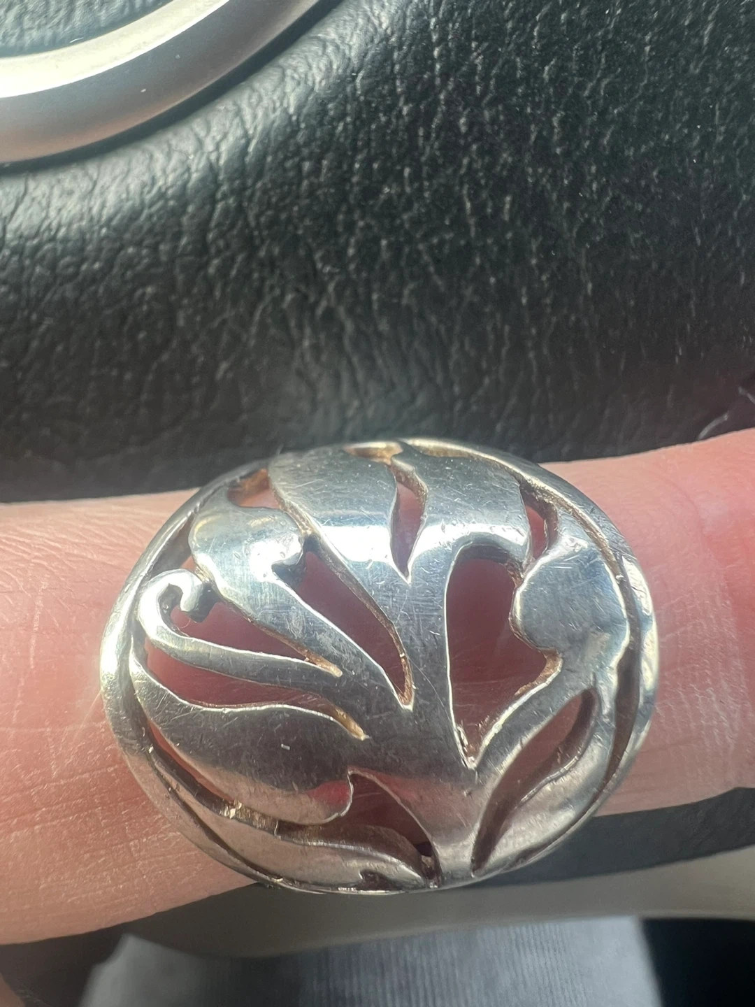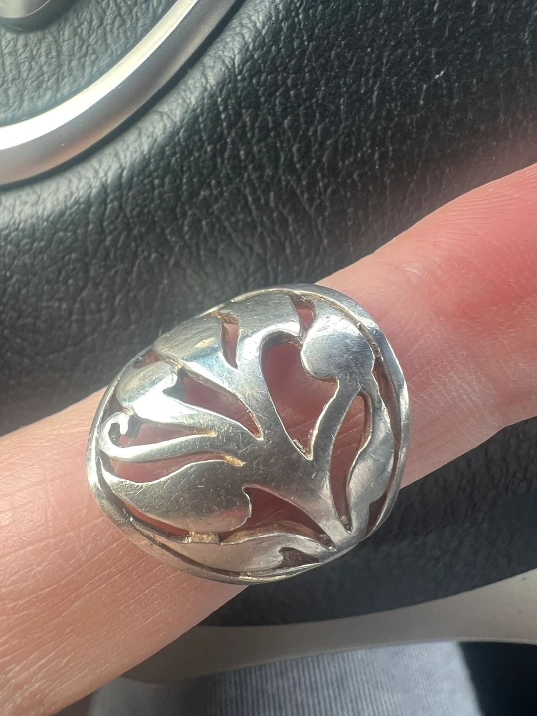 This unique ring is crafted from sterling silver with a delicate filigree design. It's a statement piece that adds a touch of elegance to any outfit. The openwork pattern allows for a comfortable and stylish fit.