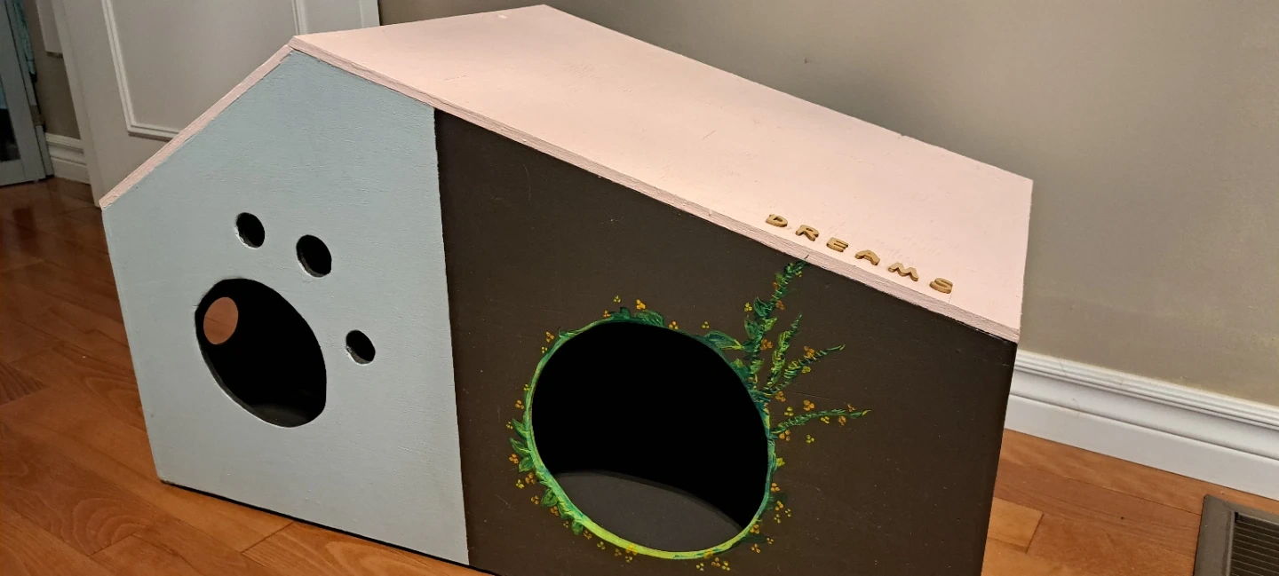 A cute, handmade wooden pet house with multiple openings and 'DREAMS' spelled out on top. This cozy structure is painted in soft pink, light blue, and dark brown with a whimsical vine design. It's a lovely spot for your furry friend!