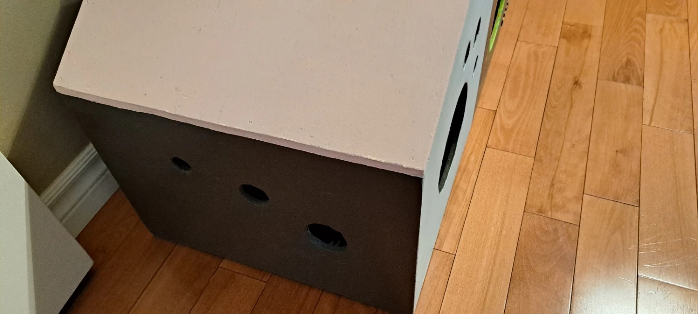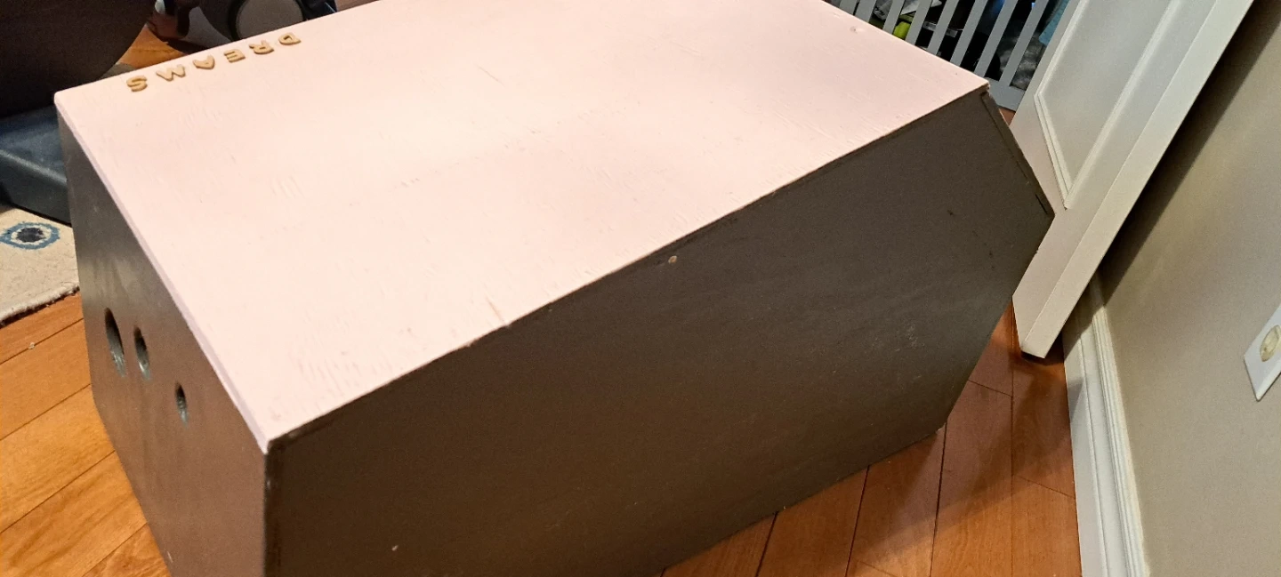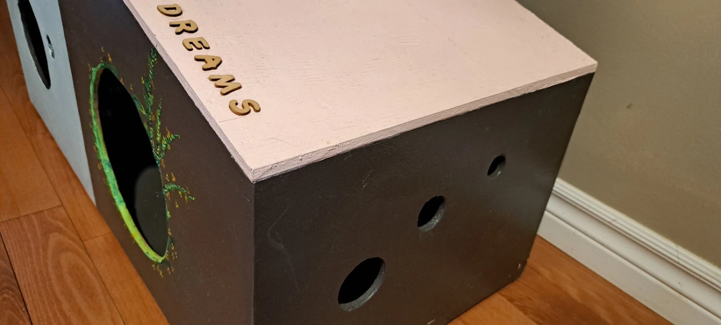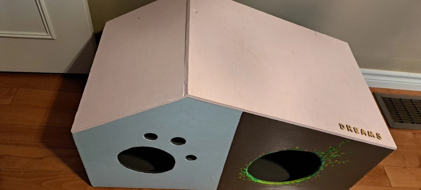 A cute, handmade wooden pet house with multiple openings and 'DREAMS' spelled out on top. This cozy structure is painted in soft pink, light blue, and dark brown with a whimsical vine design. It's a lovely spot for your furry friend!