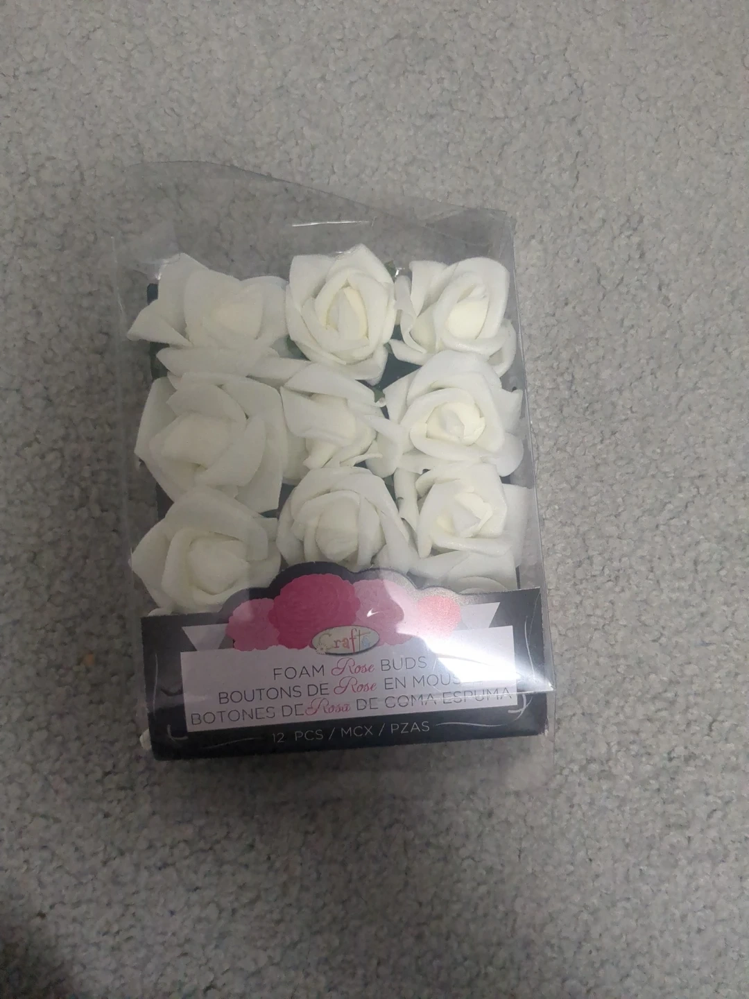 A pack of 12 white foam rose buds is available. These craft roses are made from foam and are suitable for various crafting projects. They are in a plastic package.