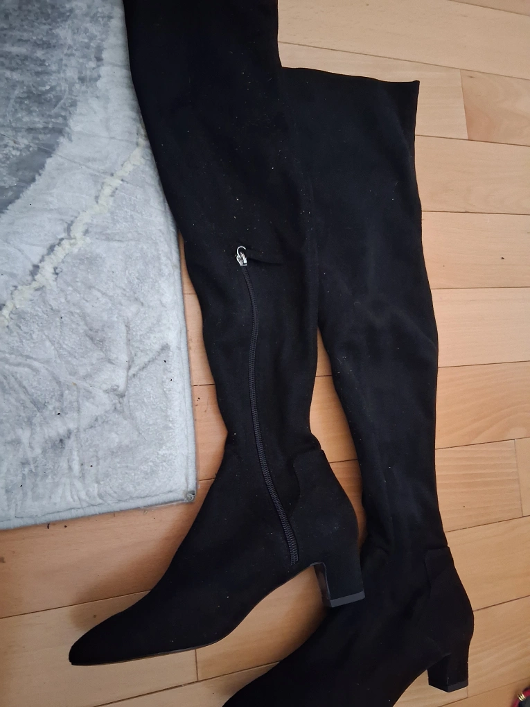 These black over-the-knee boots are made of a soft suede-like material. They feature a side zipper for easy on and off and a low block heel. The boot shaft extends above the knee.