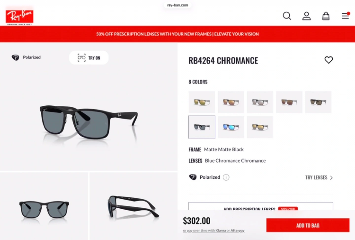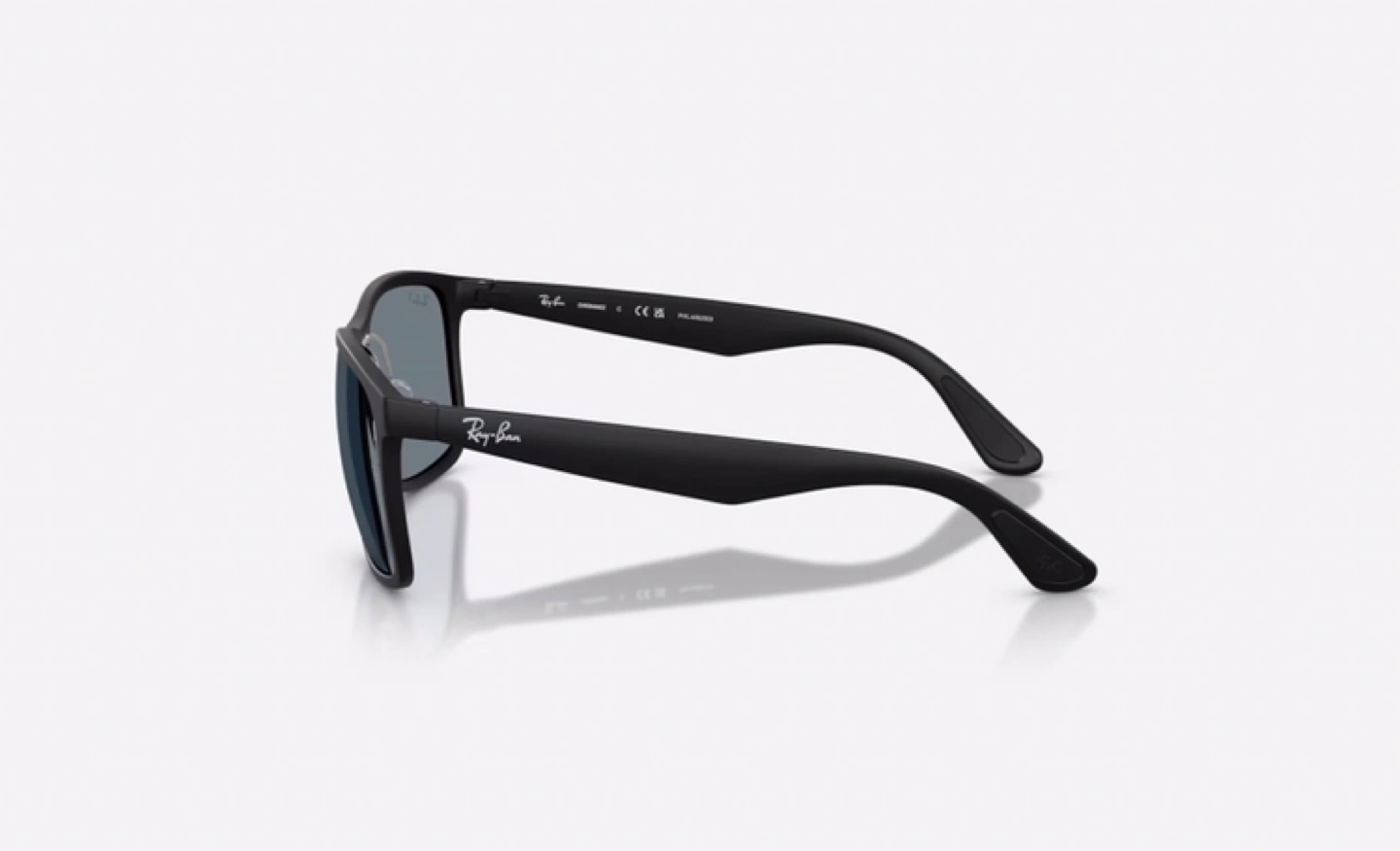 Ray-Ban RB4264 Chromance sunglasses feature a matte black square frame with blue chromance polarized lenses. Frame material is nylon and temple length is 145 mm. Includes original box, case, and cleaning cloth. These sunglasses offer standard face coverage with adjustable nose pads.