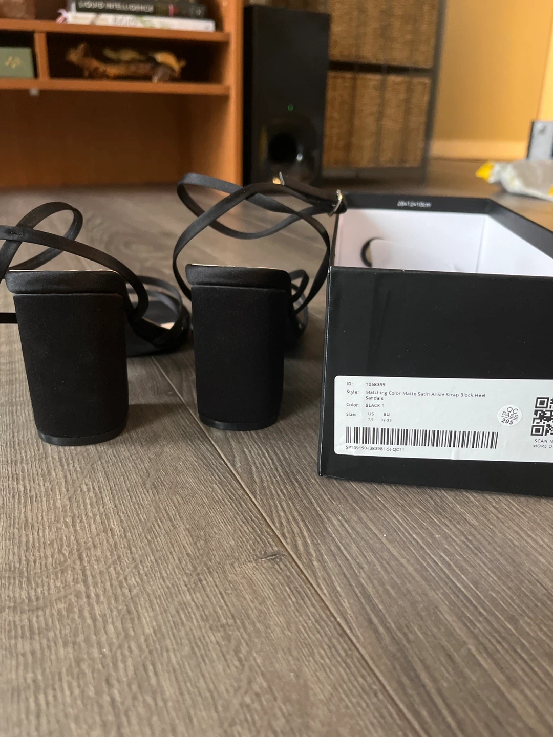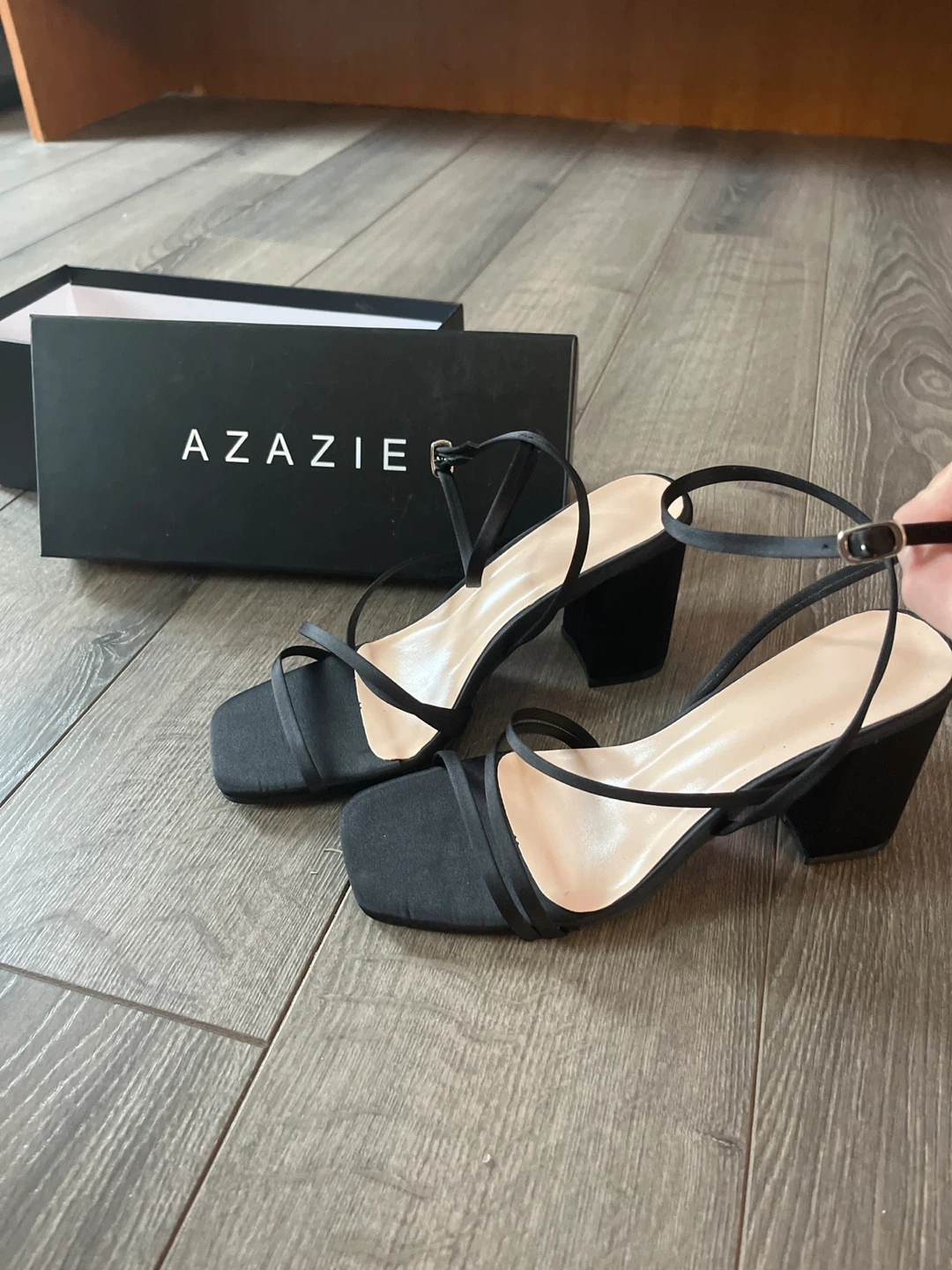 Azazie black satin strappy heels in size 7.5! Never worn, only tried on at home and needed a bigger size. Unfortunately waited too long to return them.