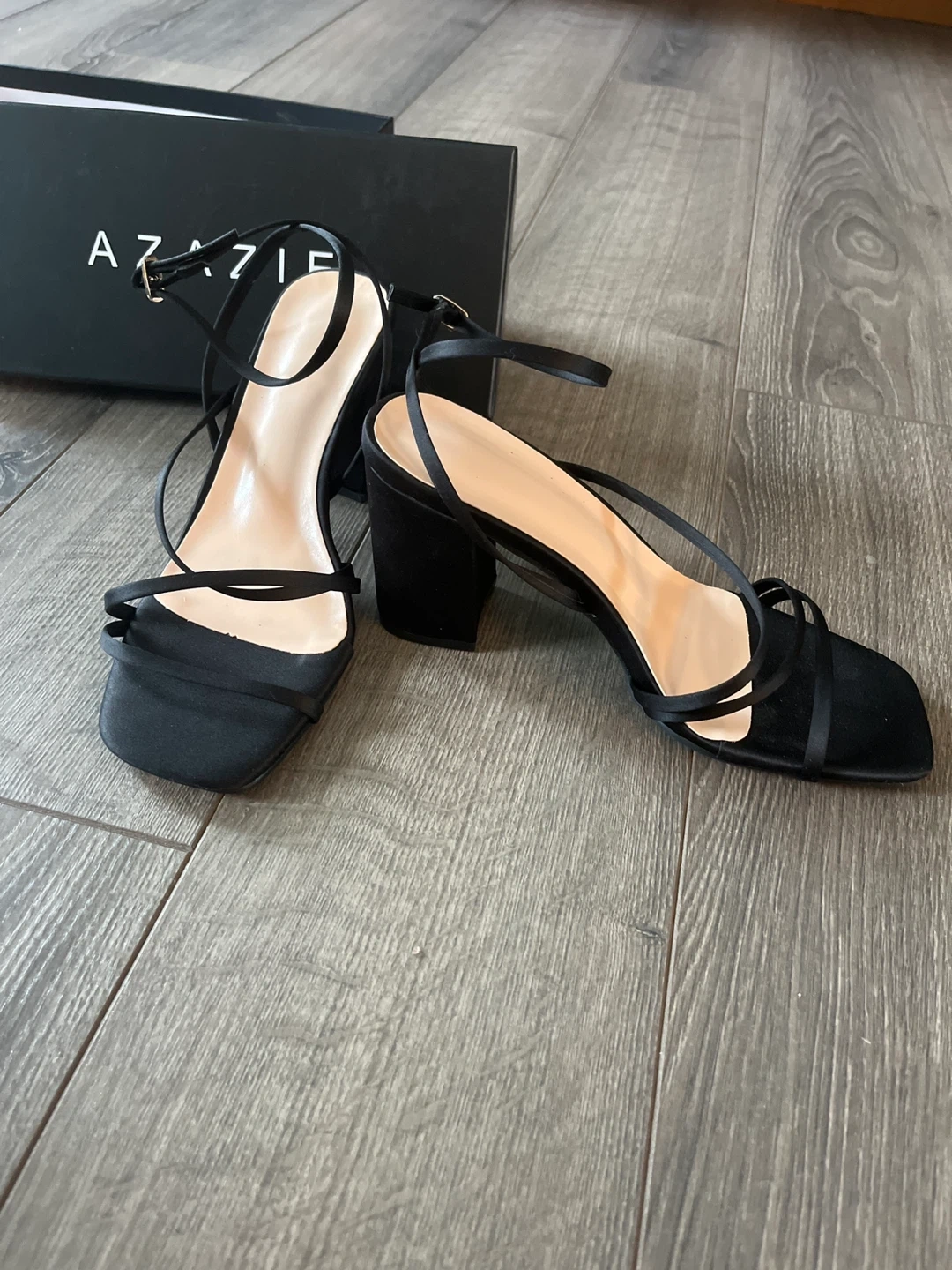 Azazie black satin strappy heels in size 7.5! Never worn, only tried on at home and needed a bigger size. Unfortunately waited too long to return them.