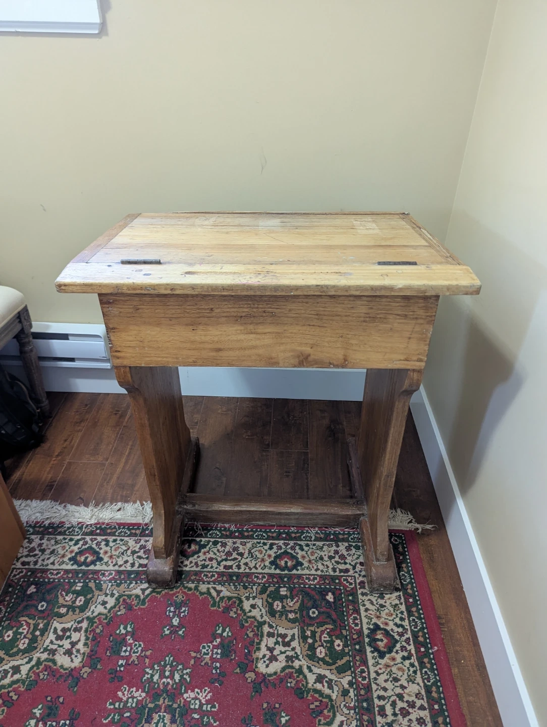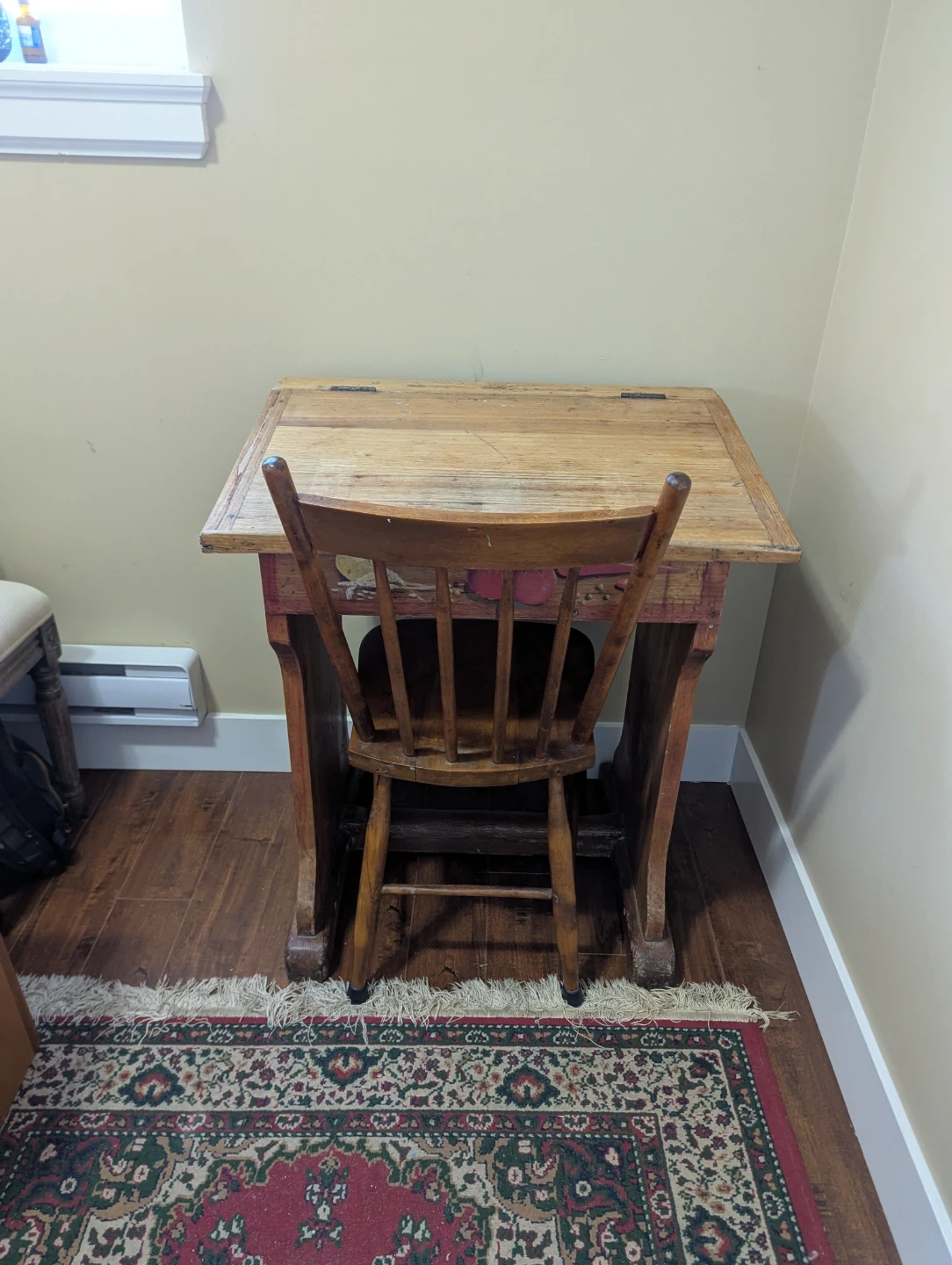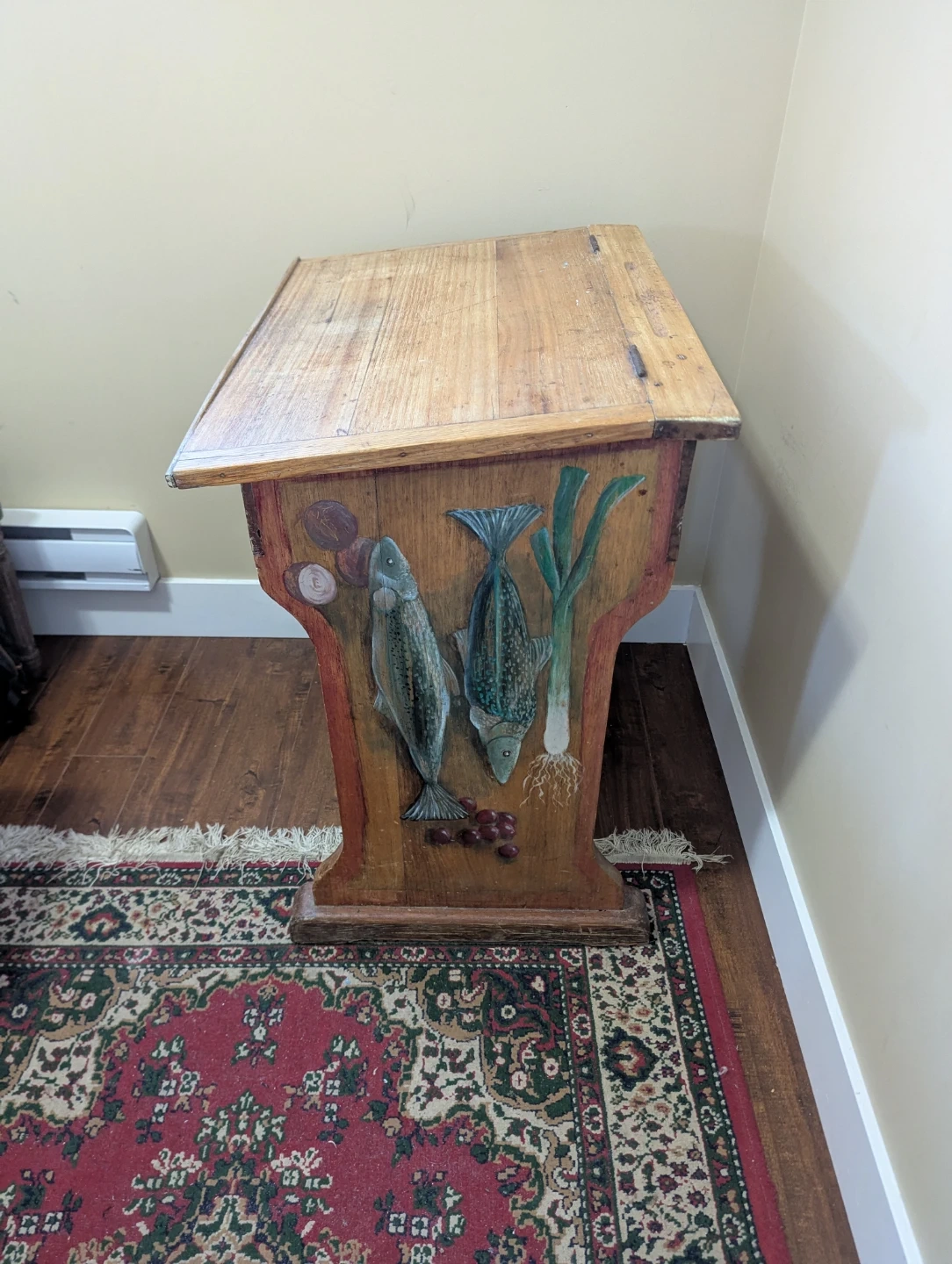 This charming vintage wooden desk features a lift-top lid and hand-painted designs of fish and vegetables on the sides. It's a unique piece with a rustic aesthetic. The desk includes a matching wooden chair.