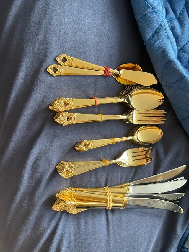 Elevate your dining experience with this elegant gold cutlery set, perfect for adding a touch of luxury to any meal. This set includes forks, spoons and knives. Specifications: Material: Gold plated stainless steel Style: Ornate design. Cash accepted. Curbside pick up available.