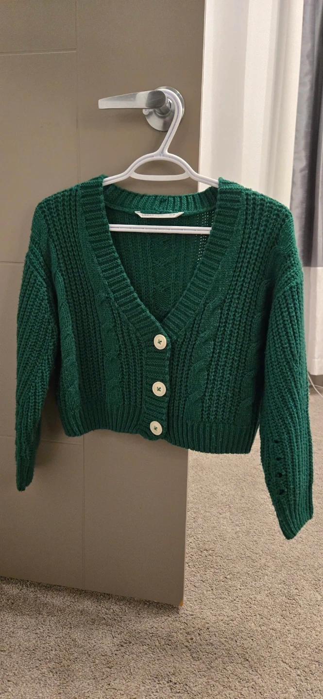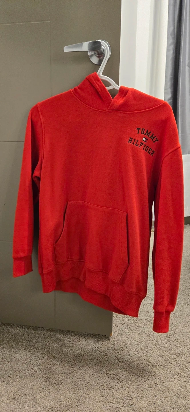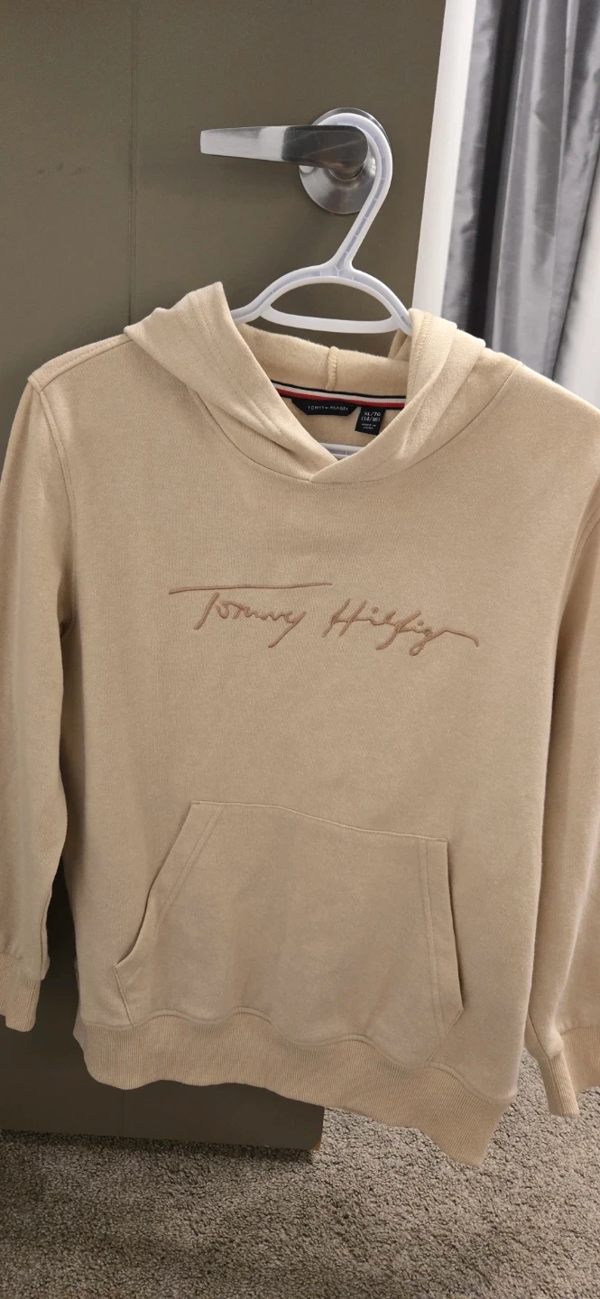 Selling a variety of clothing items including a Tommy Hilfiger hoodie, a light blue long-sleeve shirt, a pink bodysuit, and a green cardigan. All in great condition and ready for a new home!
