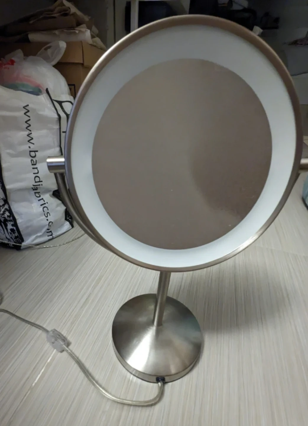 This vanity mirror features an integrated LED light ring. It's a tabletop model with a brushed metal finish. Perfect for applying makeup or grooming with clear illumination.