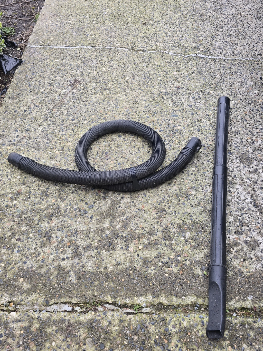 Black vacuum cleaner hose and wand attachment. This set includes a flexible corrugated hose and a rigid extension wand with a floor nozzle. They're made of durable plastic. For large ridgid vacuum comes with crevice tool