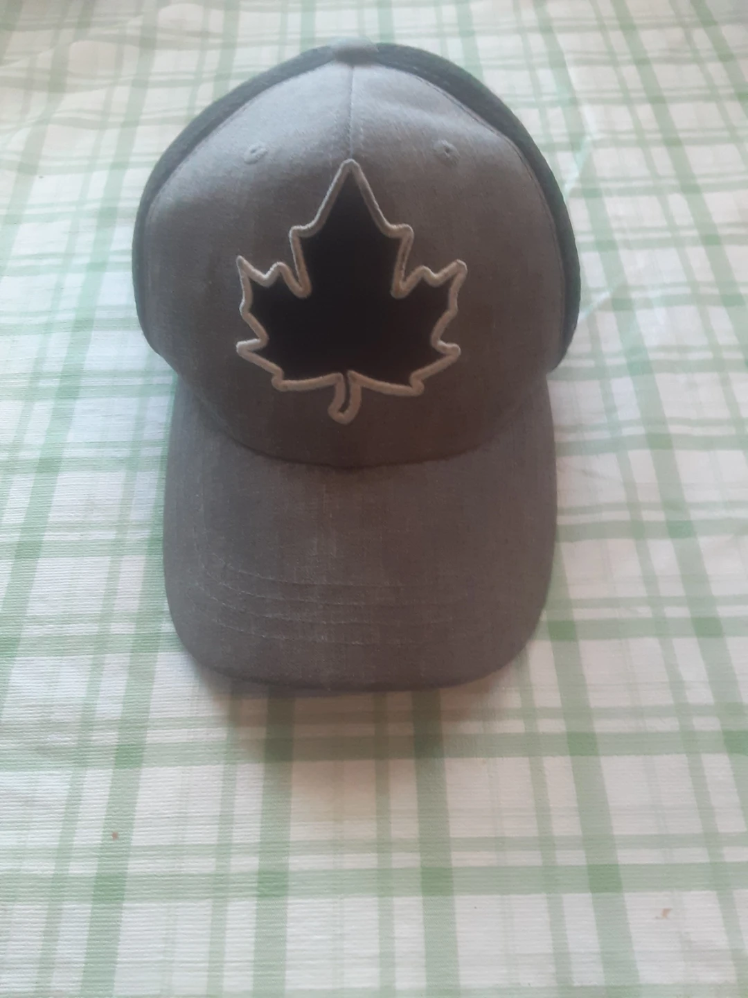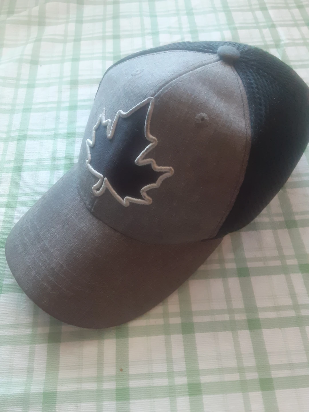 This grey baseball cap has a black mesh back for breathability. It features an embroidered black maple leaf on the front with a silver outline. It's a True North cap or associated with the Toronto Maple Leafs hockey team.