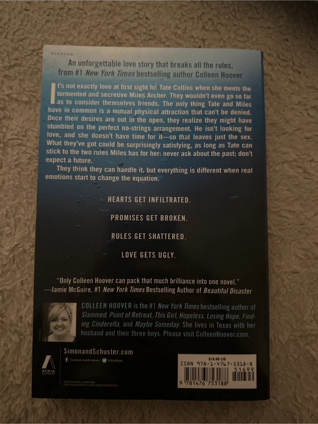 This is Colleen Hoover's #1 New York Times bestselling novel, Ugly Love. It's a story about Tate Collins and Miles Archer, exploring their complicated relationship. The book is a fiction novel by a bestselling author.