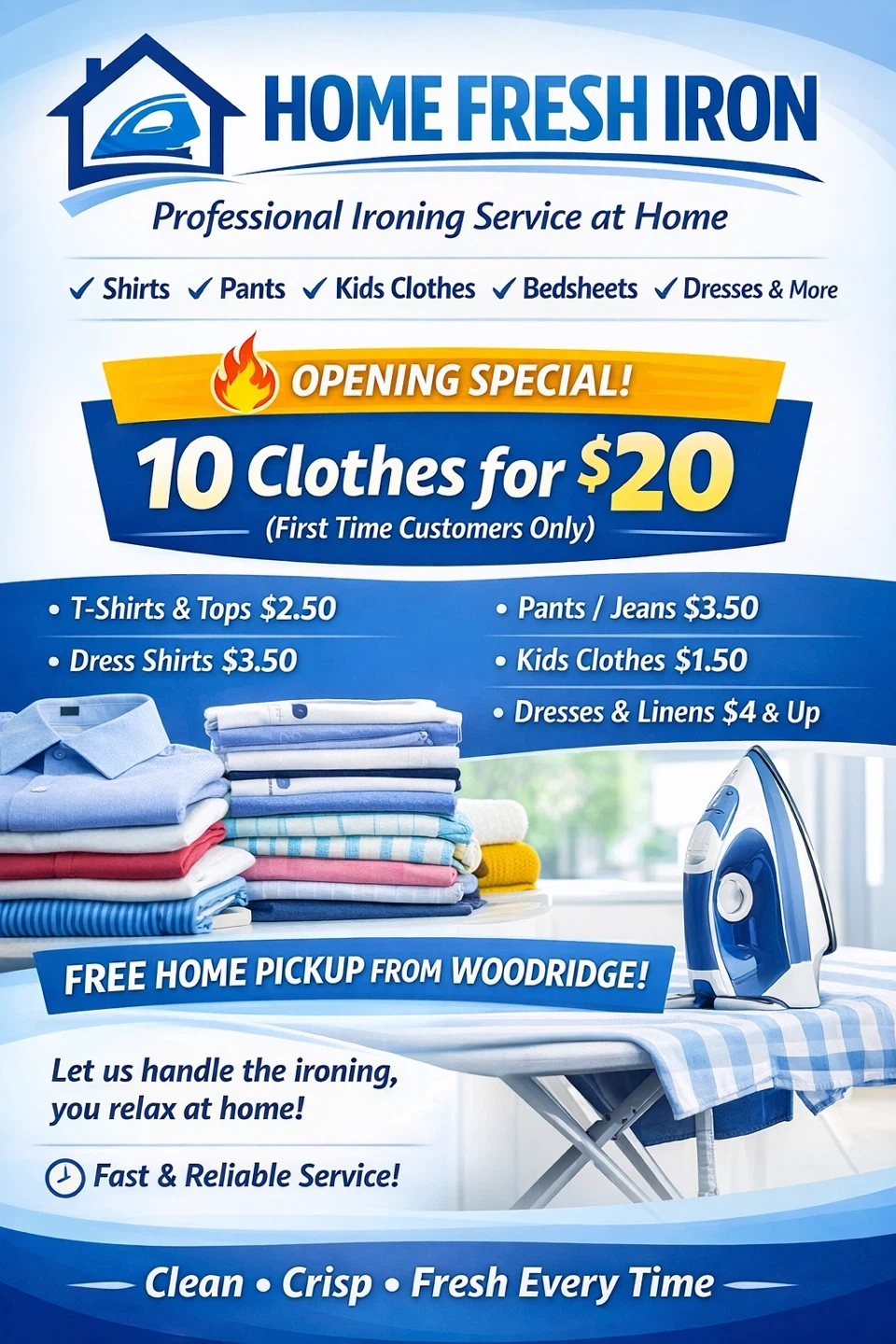 Professional ironing service for shirts, pants, kids clothes, bedsheets, dresses, and more. Offering a special for first-time customers: 10 clothes for $20! Free home pickup available from Woodridge. Let us handle the ironing so you can relax at home.