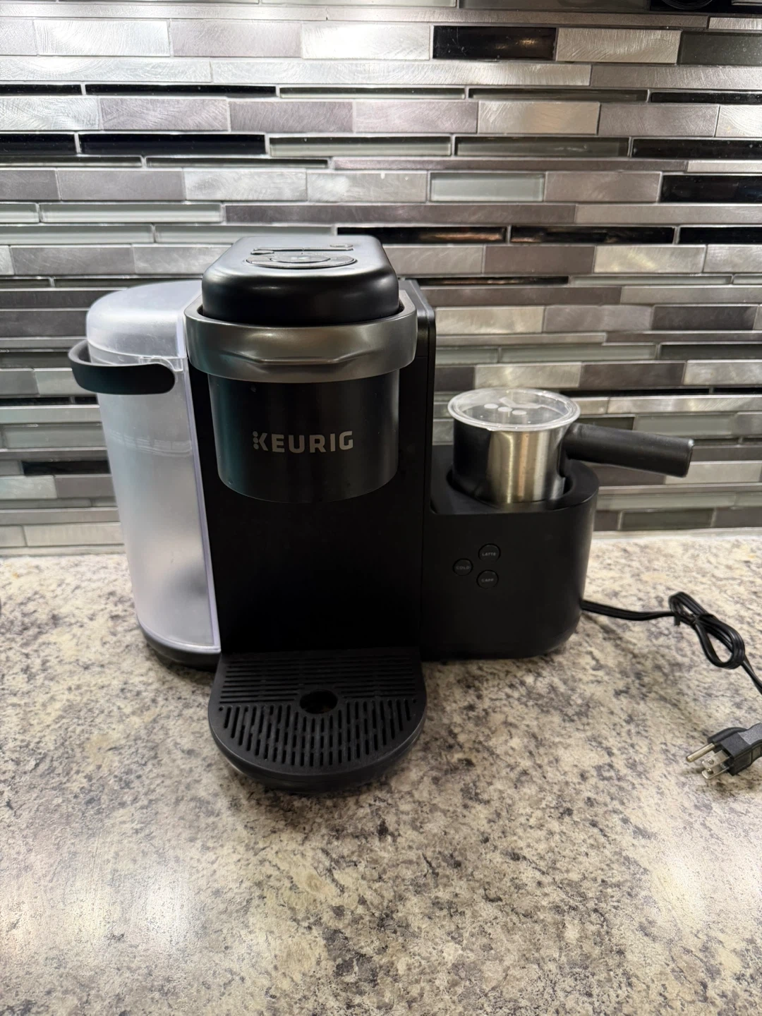 Keurig K-Cafe Special Edition coffee maker with milk frother included. Offers multiple brew sizes: 6oz, 8oz, 10oz, 12oz, and a shot option. Built-in frother for lattes and cappuccinos. Features auto-off, descale, and add water indicators.