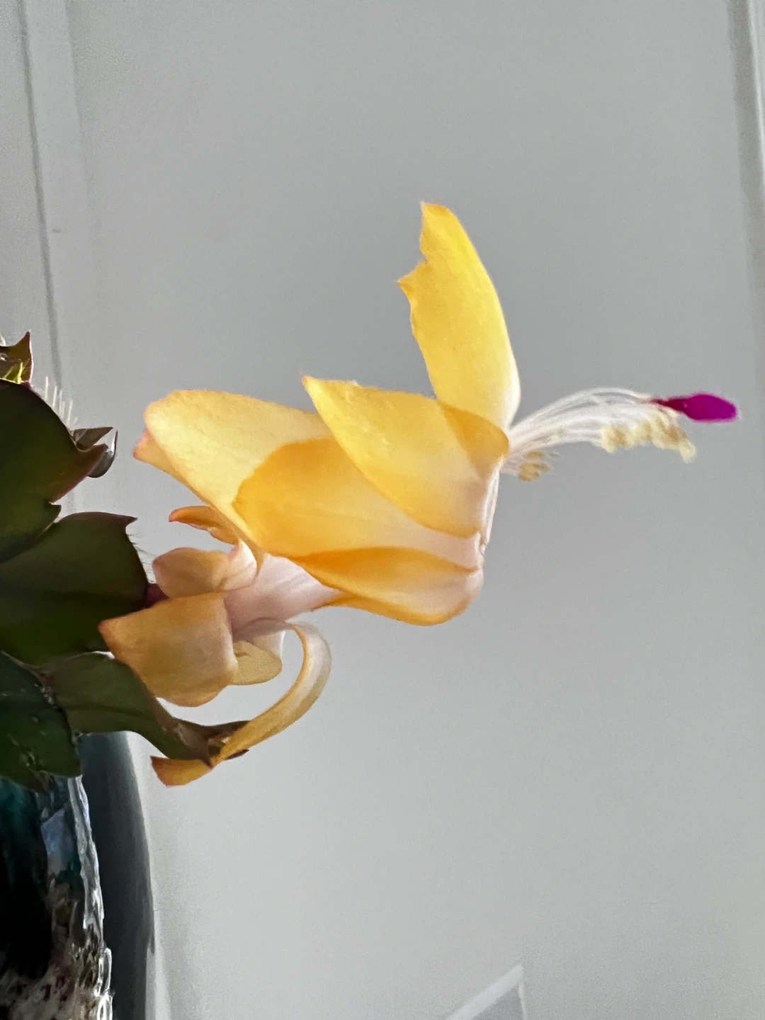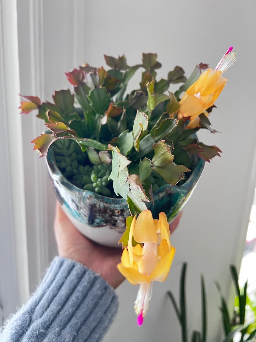 Christmas cactus plant with beautiful yellow blooms is ready for a new home. It's potted in a unique, decorative ceramic container with a glossy blue and white glaze. This plant is great for adding some colour indoors during the fall and winter months!