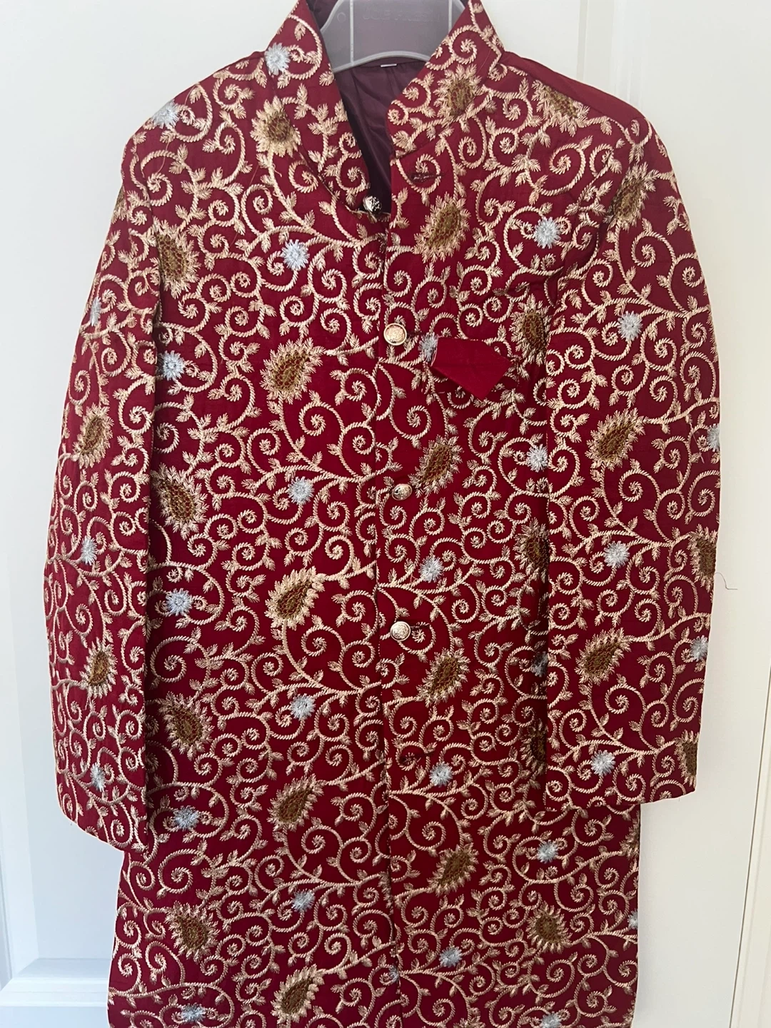 Beautiful sherwani with intricate embroidery. Perfect for a special occasion! The material is a rich red colour with gold and silver detailing.