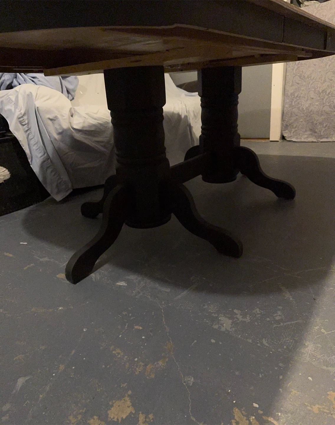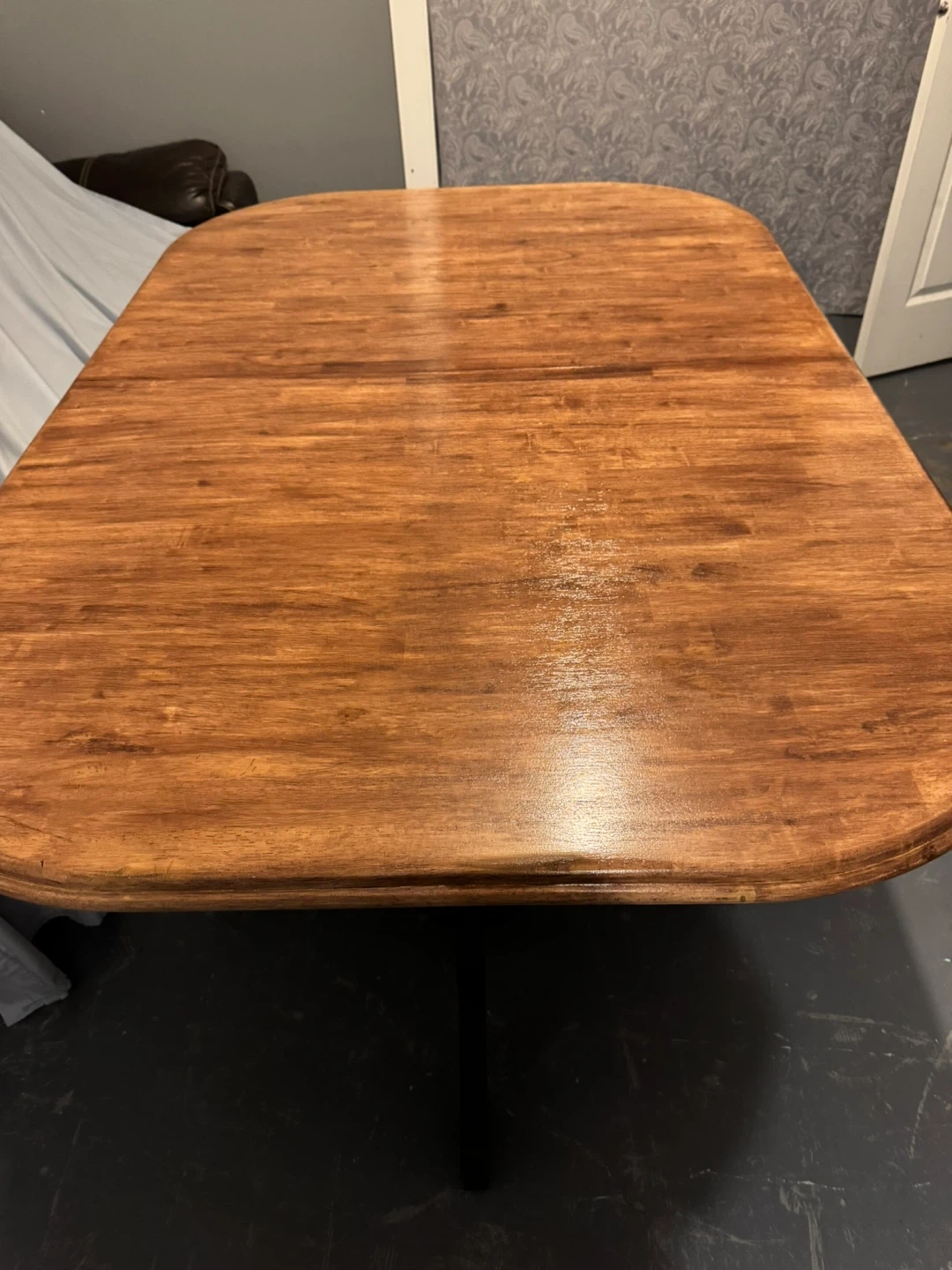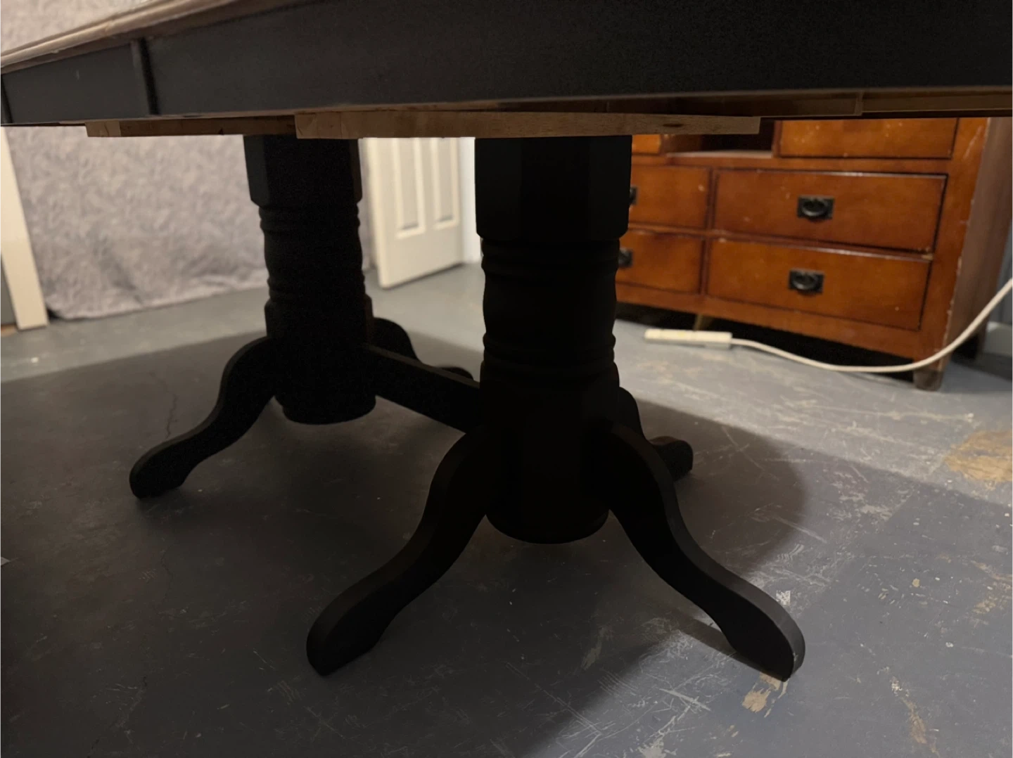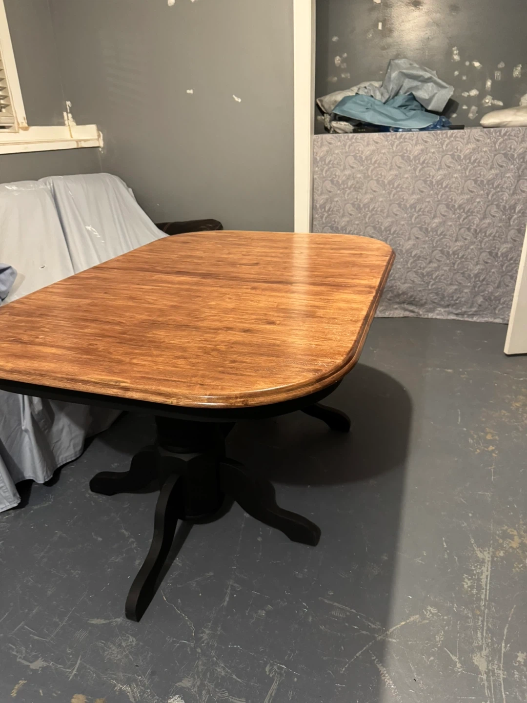 A beautiful large expandable table just in time for all those extra Christmas guests! Brand new refurbished wood dining table with a black base.
