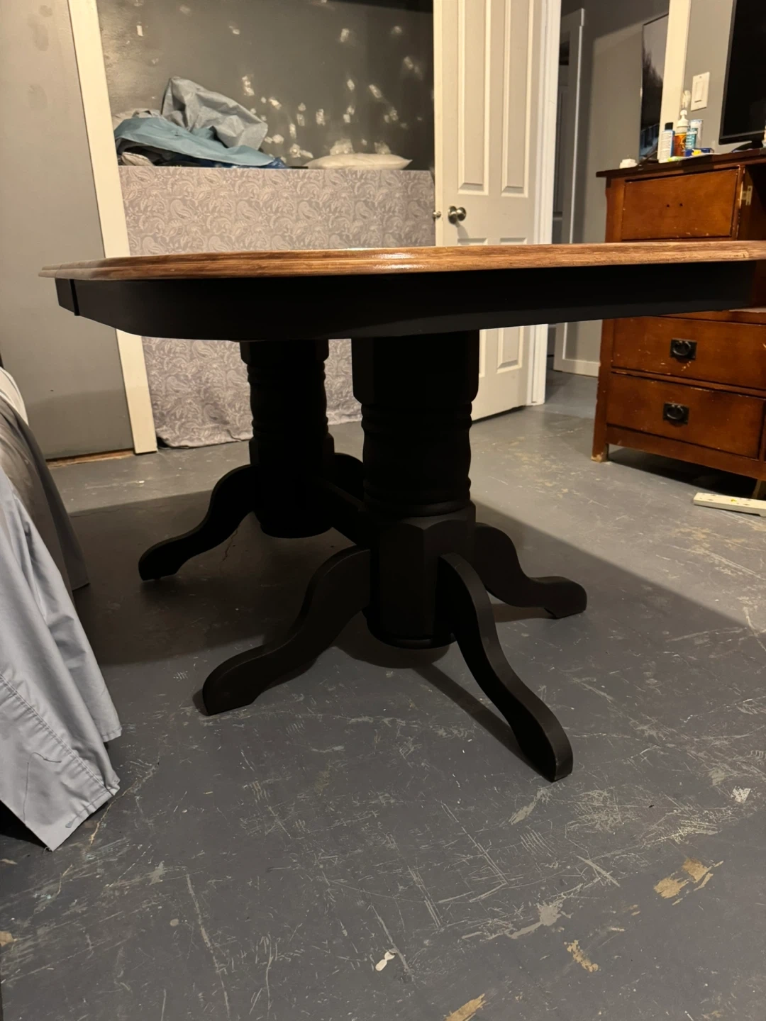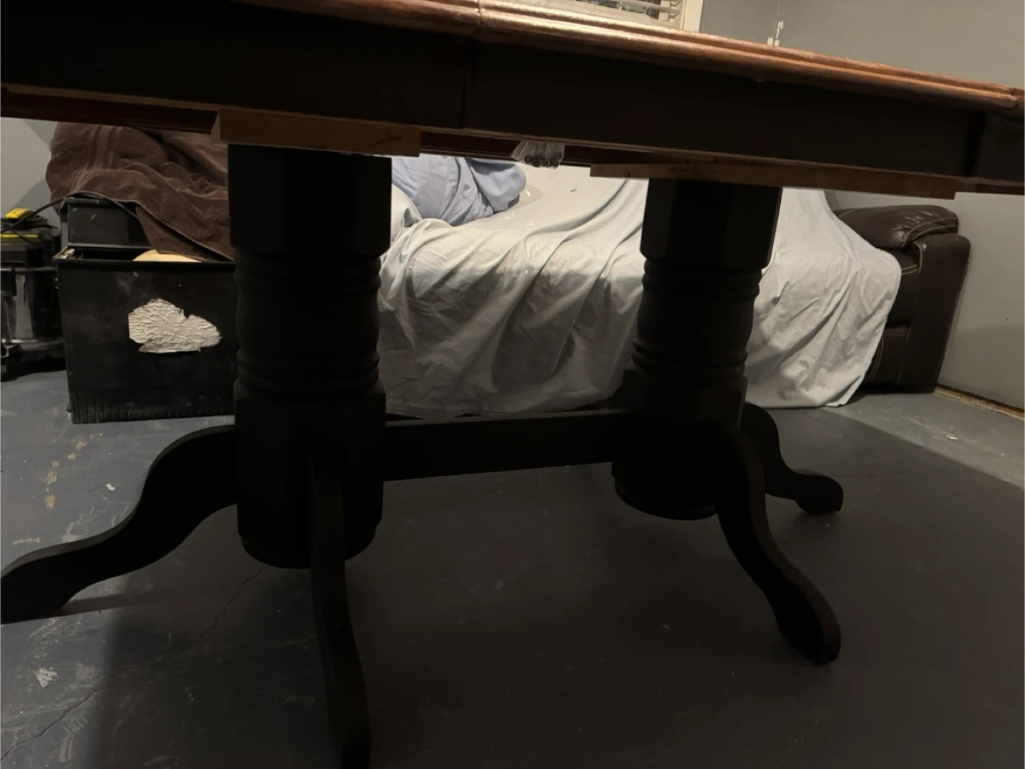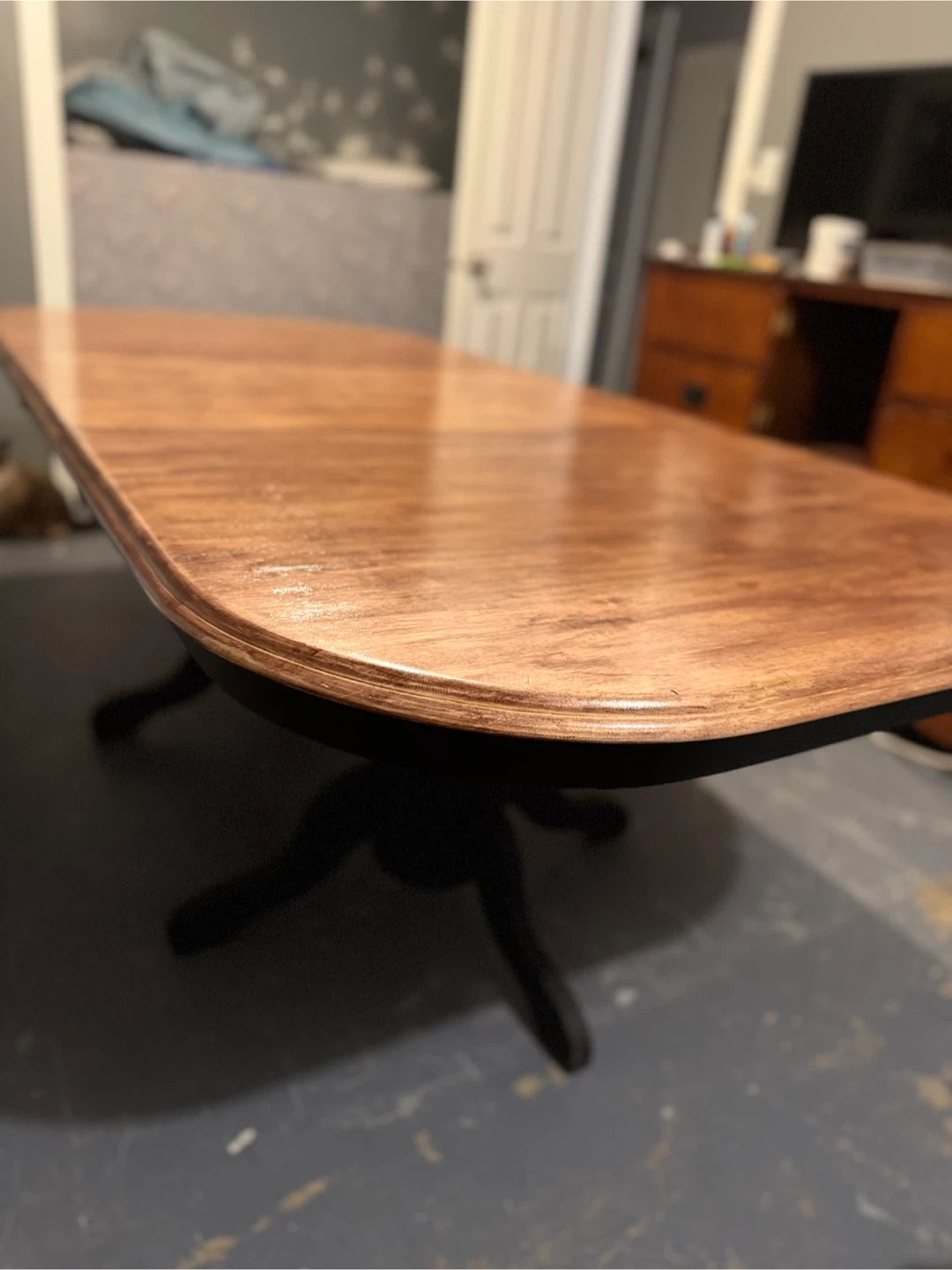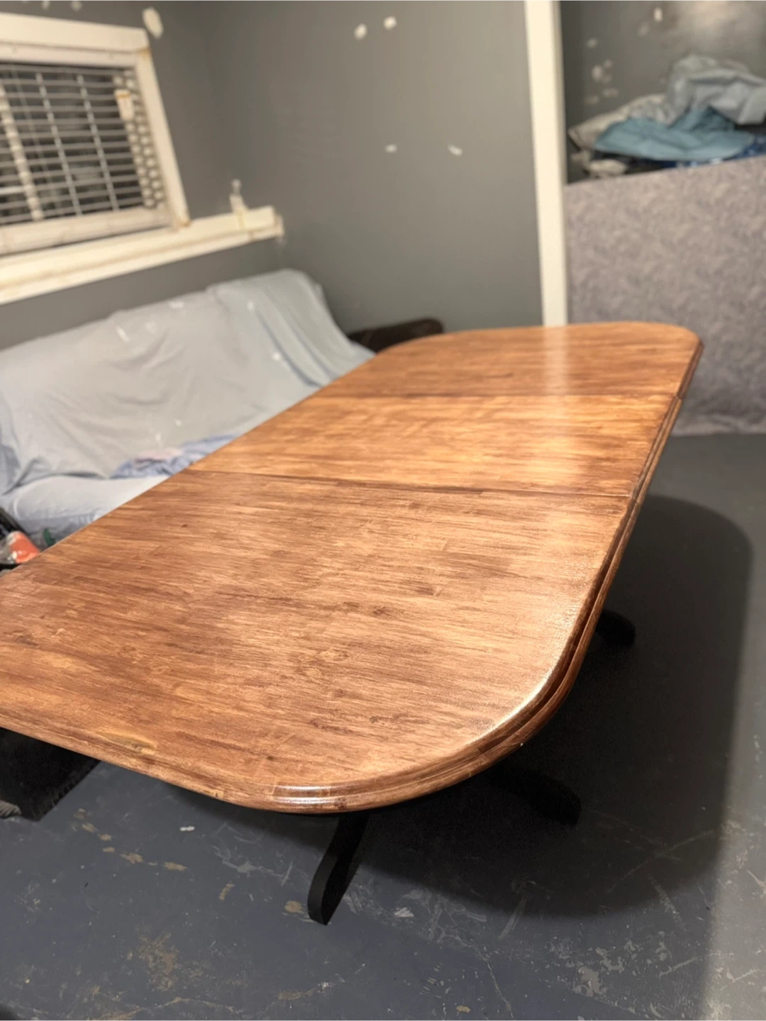 A beautiful large expandable table just in time for all those extra Christmas guests! Brand new refurbished wood dining table with a black base.