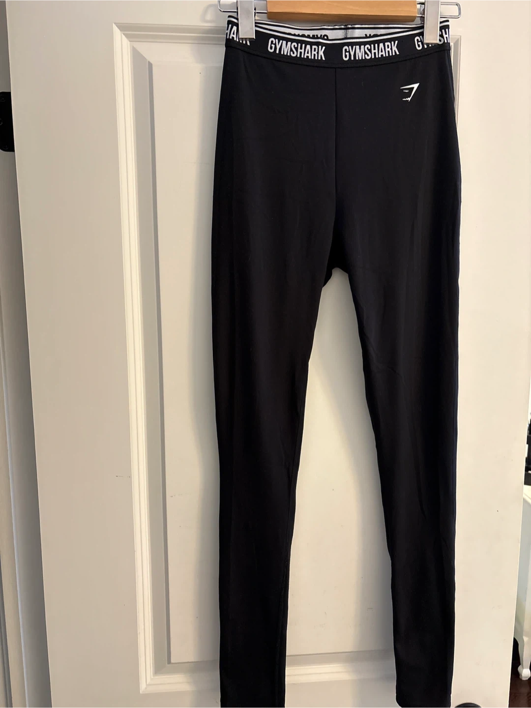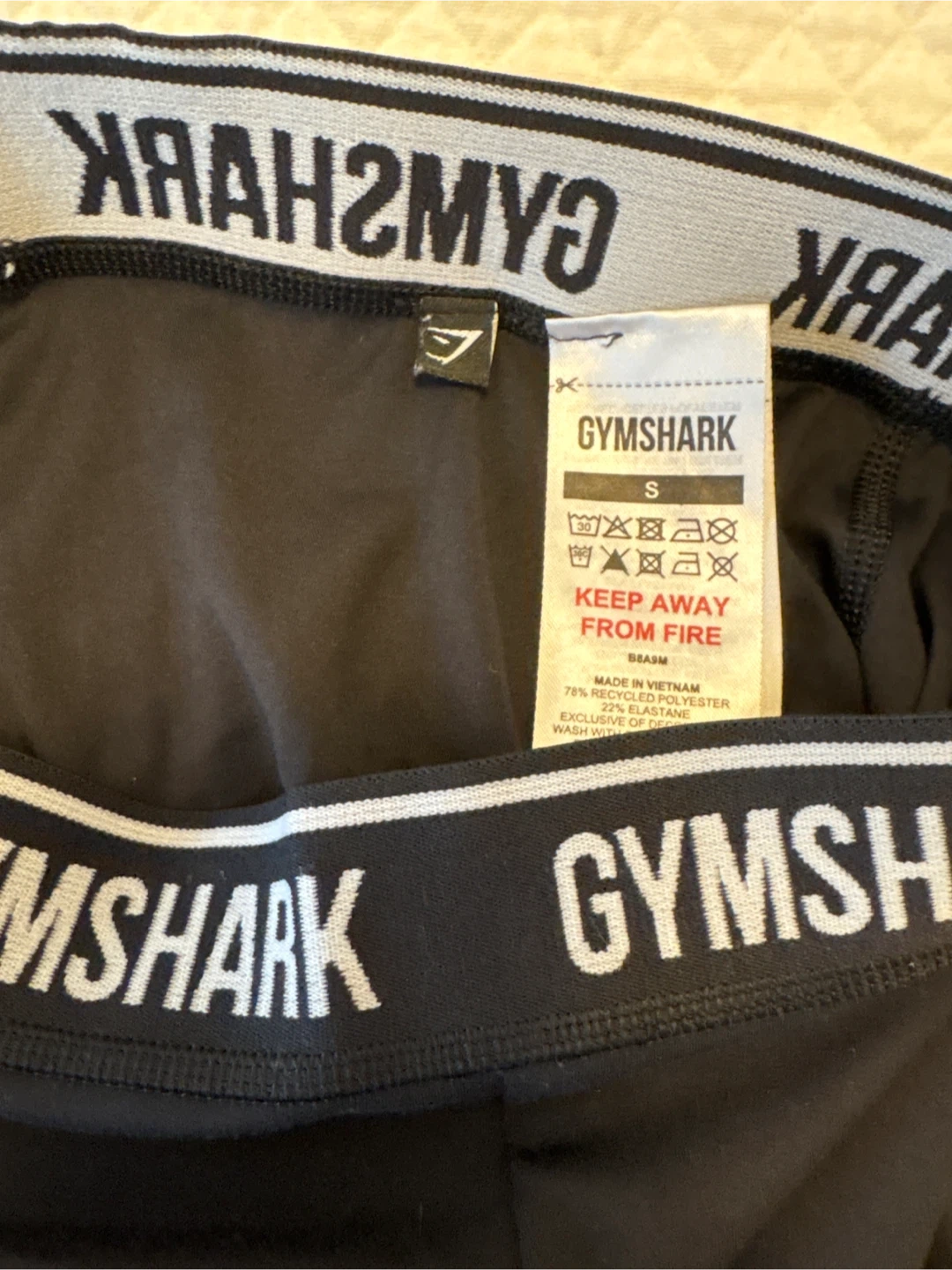 These are black Gymshark leggings. They're size small and made from 78% recycled polyester and 22% elastane. Perfect for workouts! Feel like a second skin