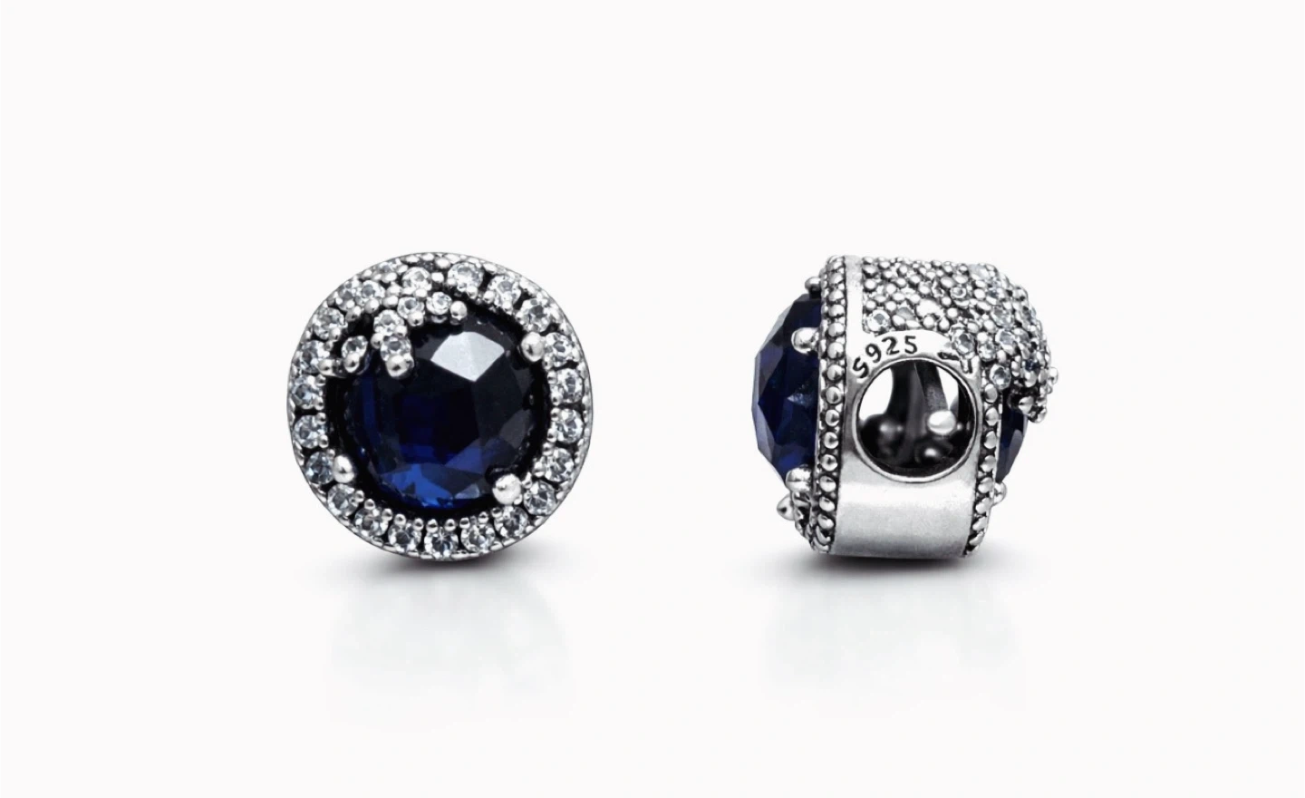 This is a Pandora charm with a deep blue cubic zirconia stone. It's accented with small clear cubic zirconia stones. The charm is made of sterling silver and stamped "S925". It's a lovely addition to a bracelet!