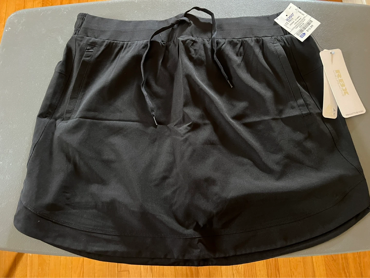 RBX skort in black. It's a size Large with an elastic waistband and drawstring. Side pockets Built-in shorts for extra coverage. Item comes from a pet and smoke free home. Port union/401/Pickering.