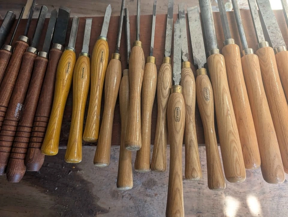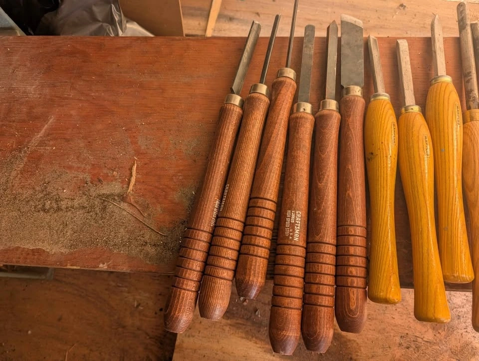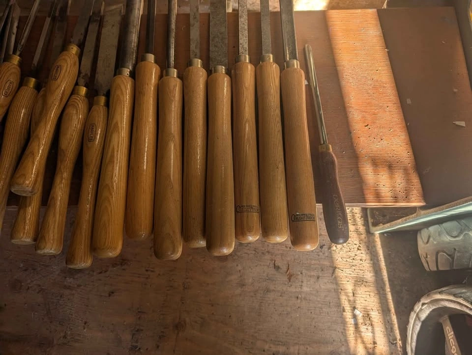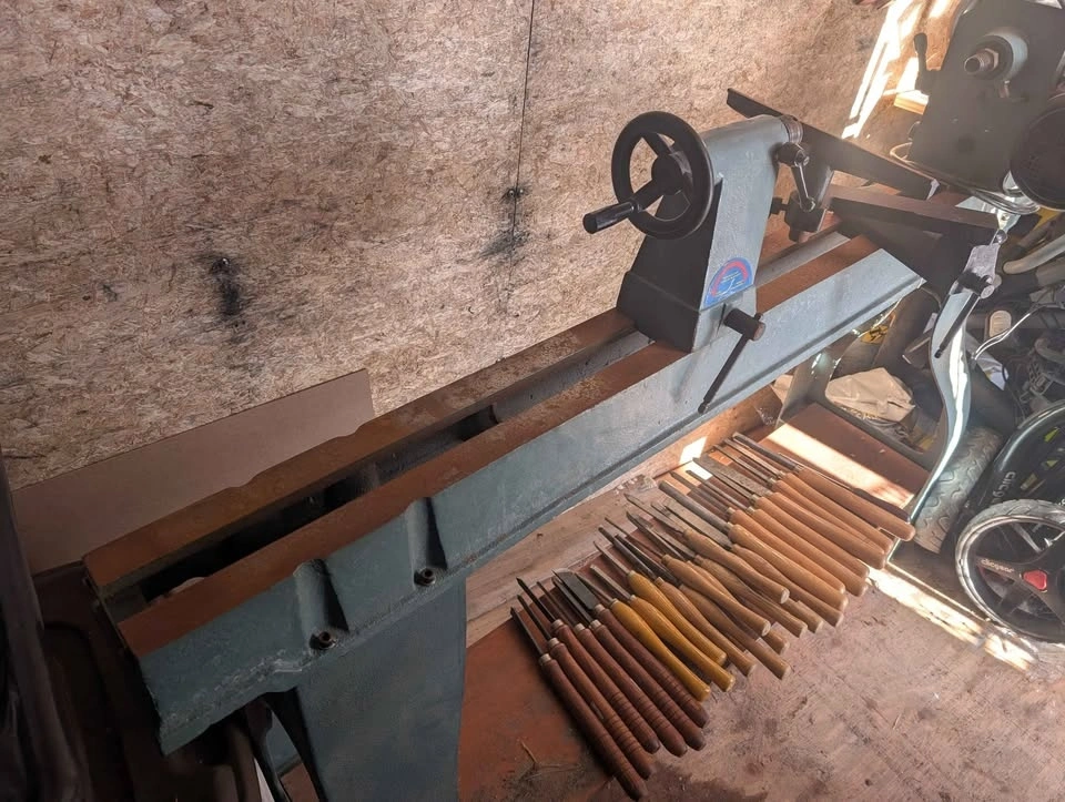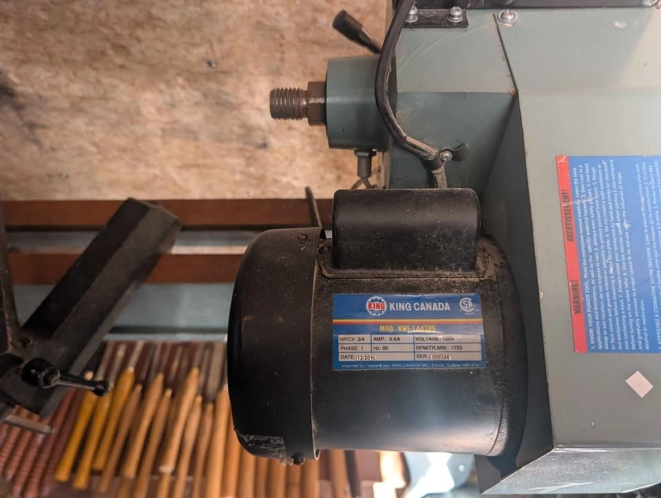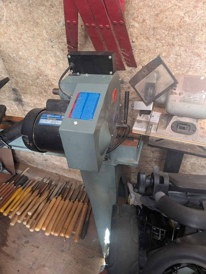 King Canada wood lathe in perfect working order. Includes headstock and tailstock, many wood turning chisels, Nova chuck and bowl chuck, drill chuck, one way chisel sharpening system, and caliper set. Everything you need to start turning bowls, vases, spindles, etc. A stand bench grinder with a specified stone wheel for sharpening is also available at an extra cost.