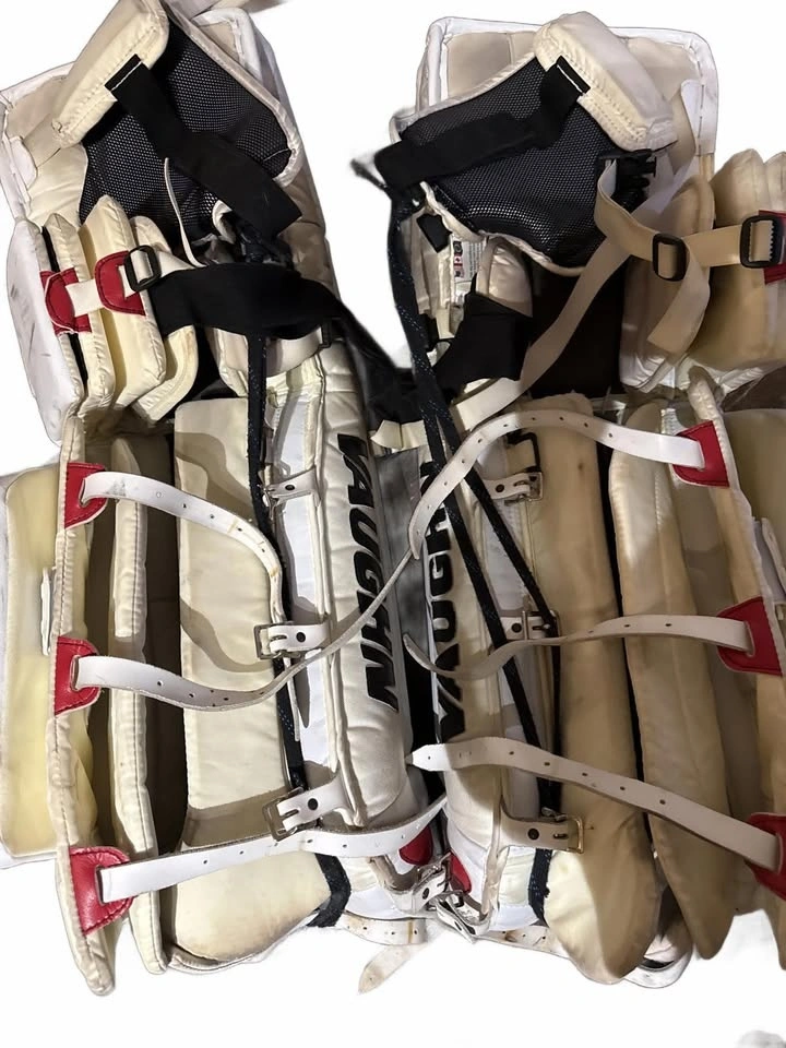 Vaughn Velocity goalie pads. These pads feature adjustable straps and padding for protection and comfort. Suitable for intermediate to advanced players. Some signs of use but overall in good condition.