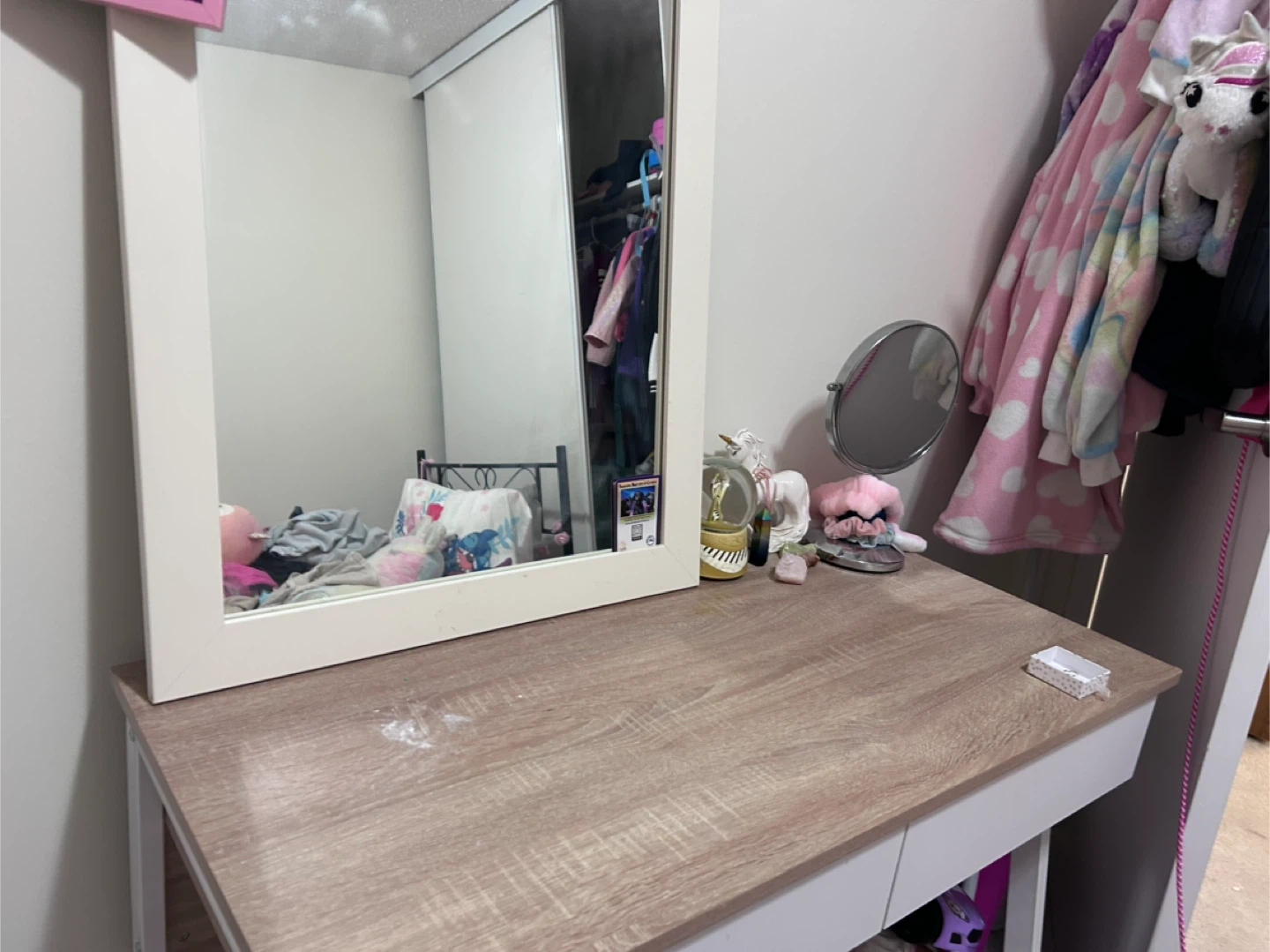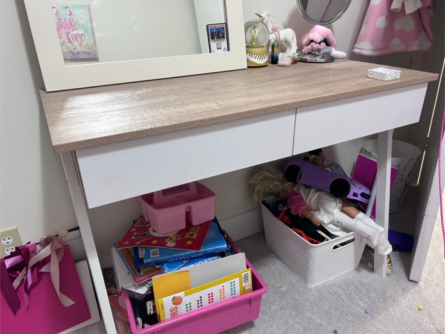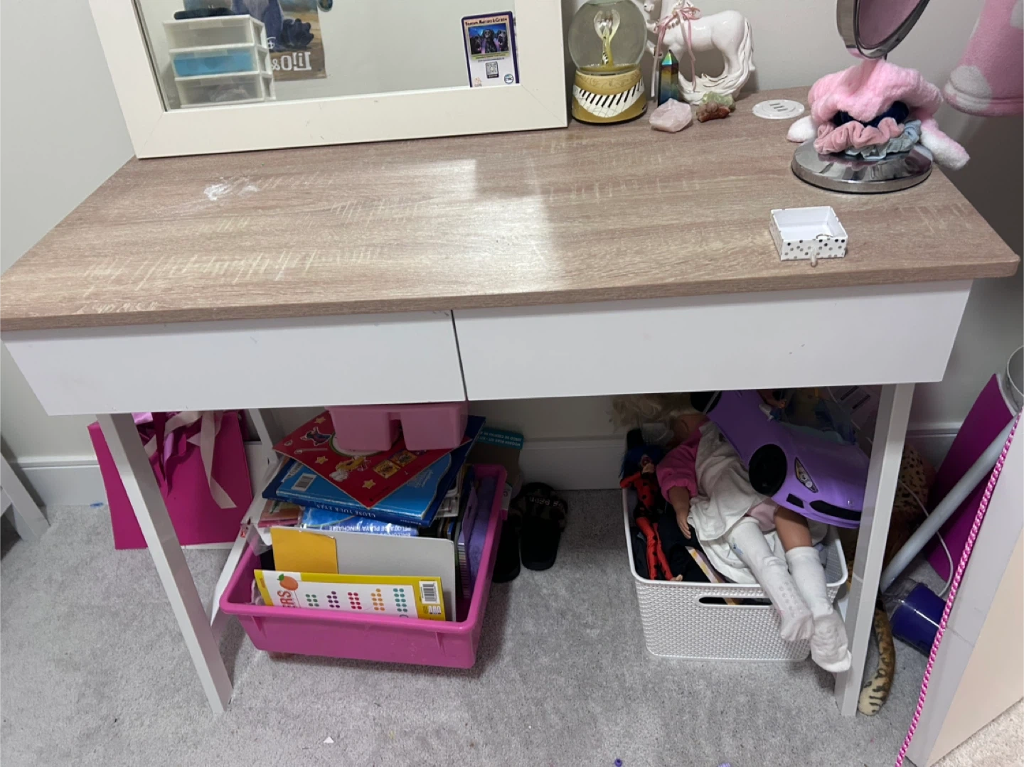 White vanity desk with a wood-look top and two drawers. It's a great spot for getting ready. This desk is perfect for a bedroom or a child's room.