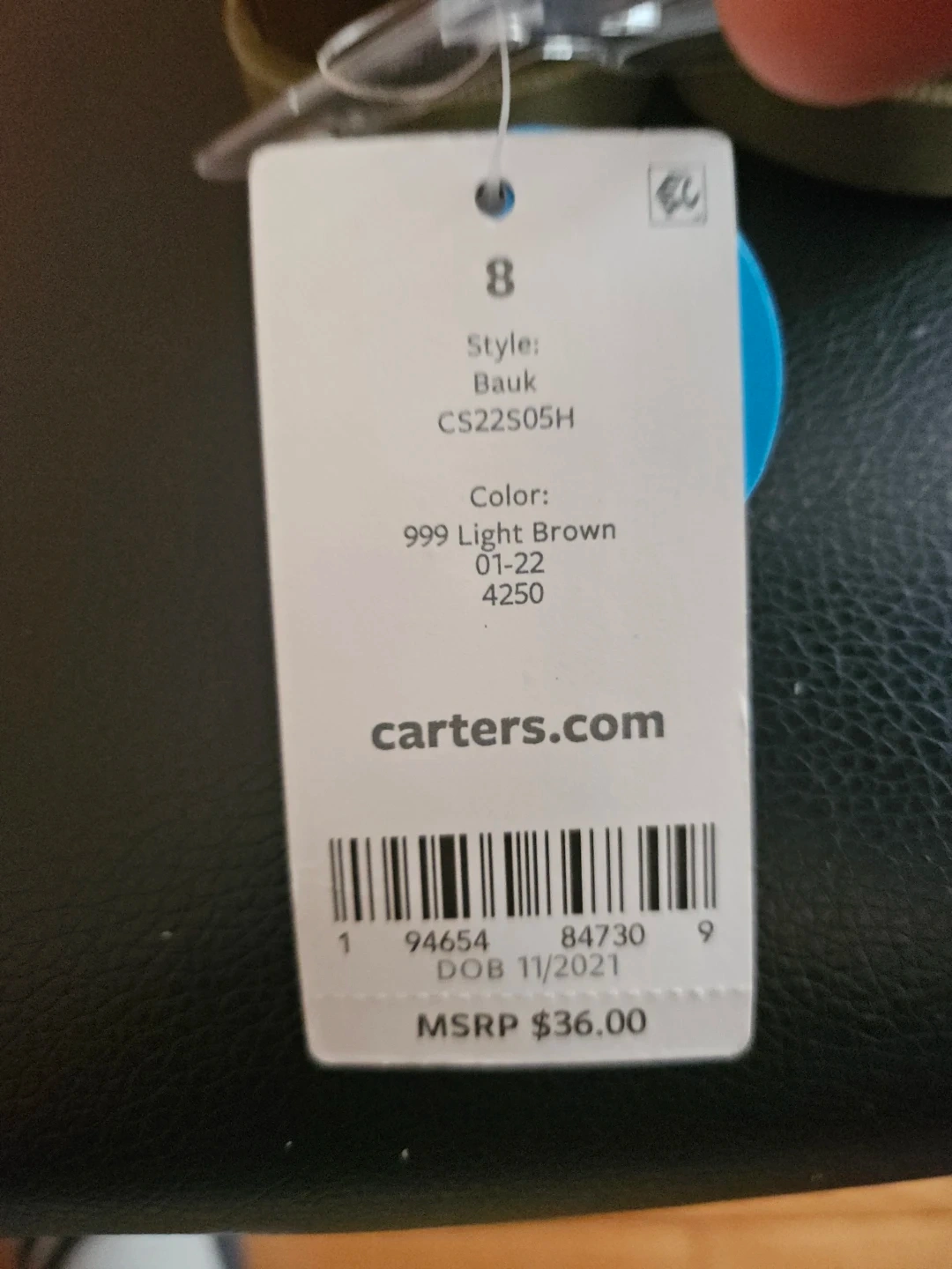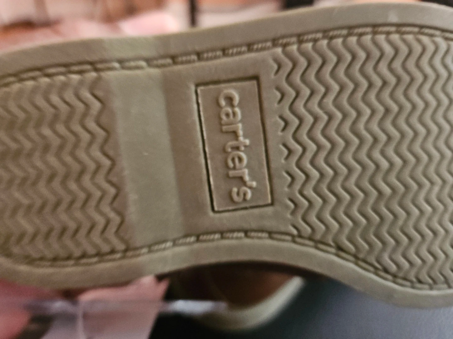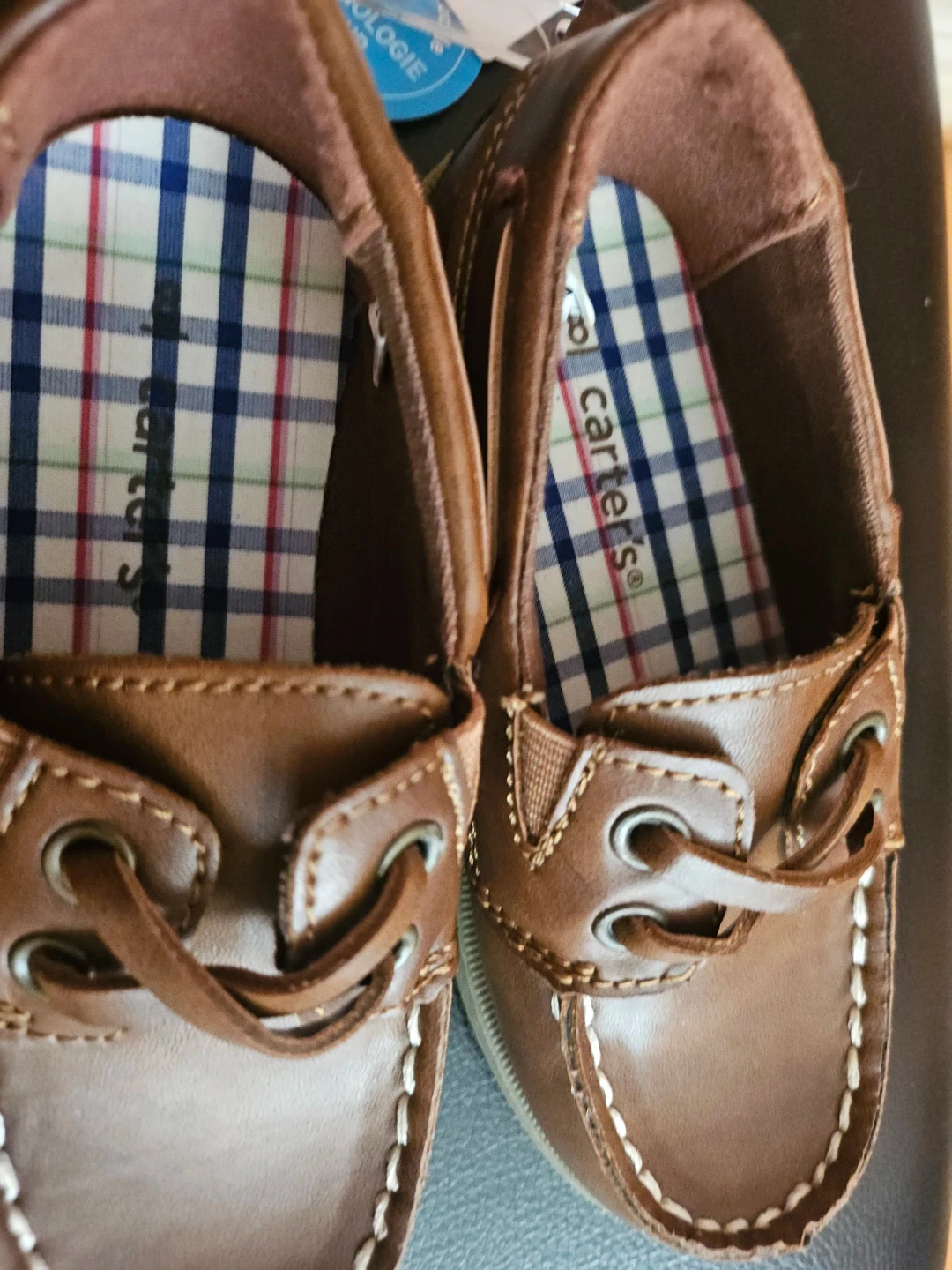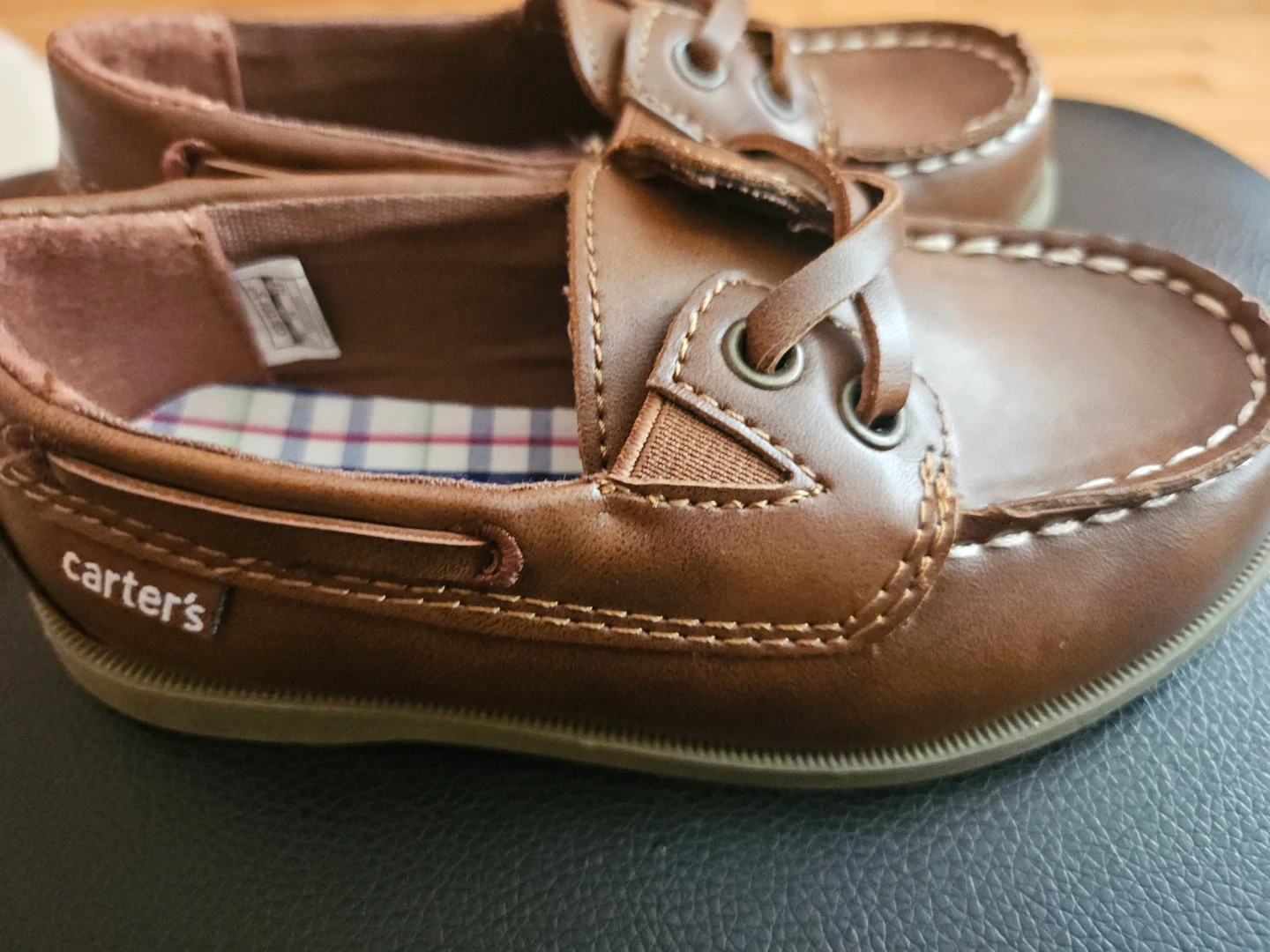 Toddler boat shoes from Carter's in a classic brown color. Features a faux-leather upper with decorative lacing and a checkered fabric lining. The soles have a grippy pattern.