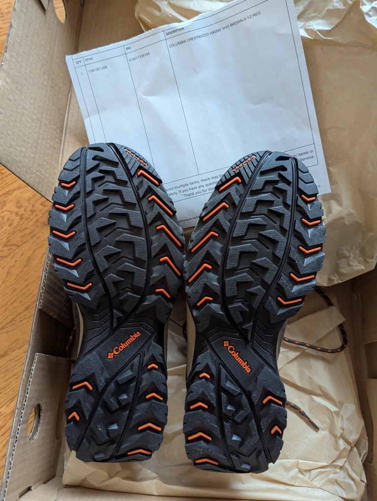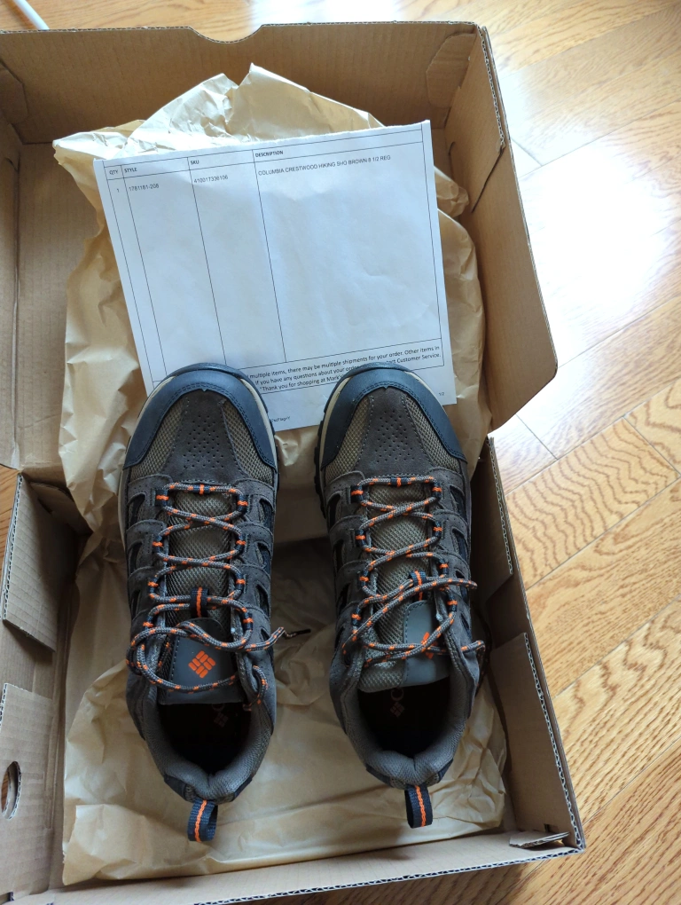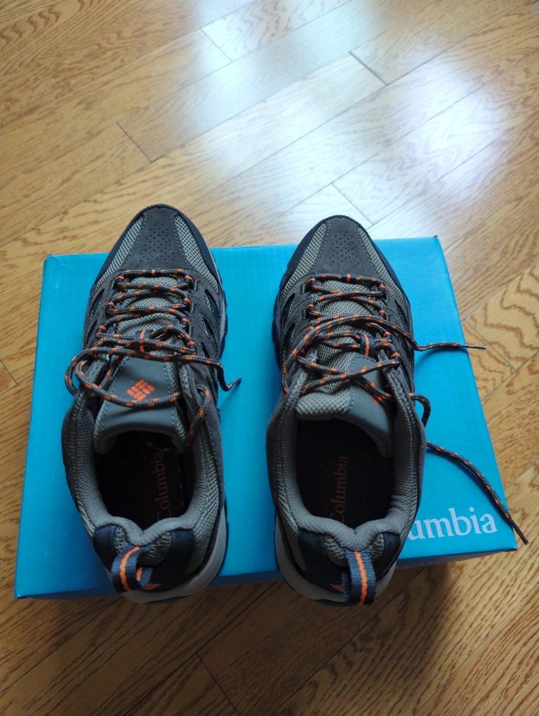 Never used , men's Columbia Crestwood hiking shoes. Size 8.5. Grey and orange accents. Good condition. Come in original box.