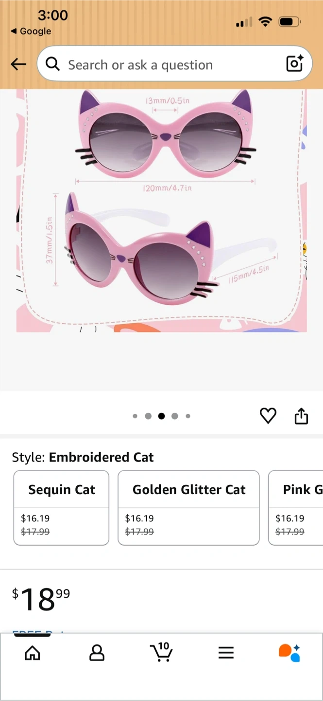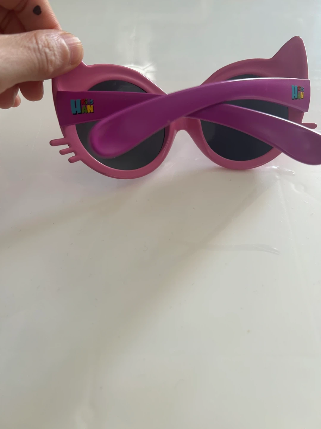 Fun pink cat-shaped sunglasses for kids. They have a playful design and offer UV protection. Great for sunny days and dressing up!