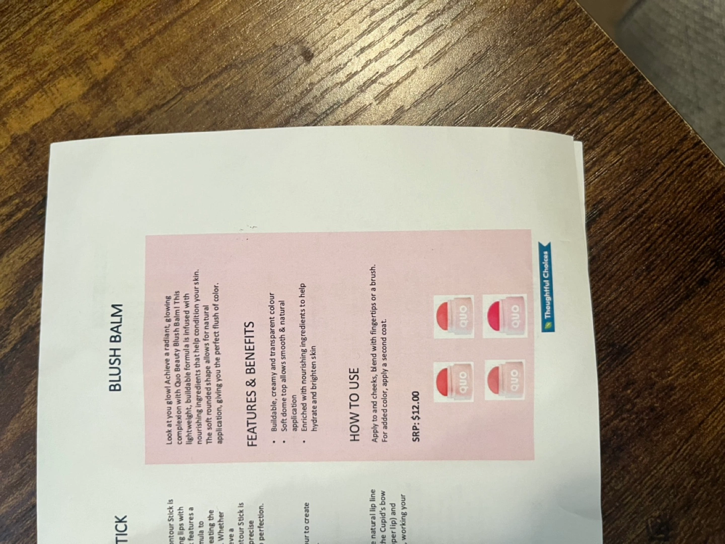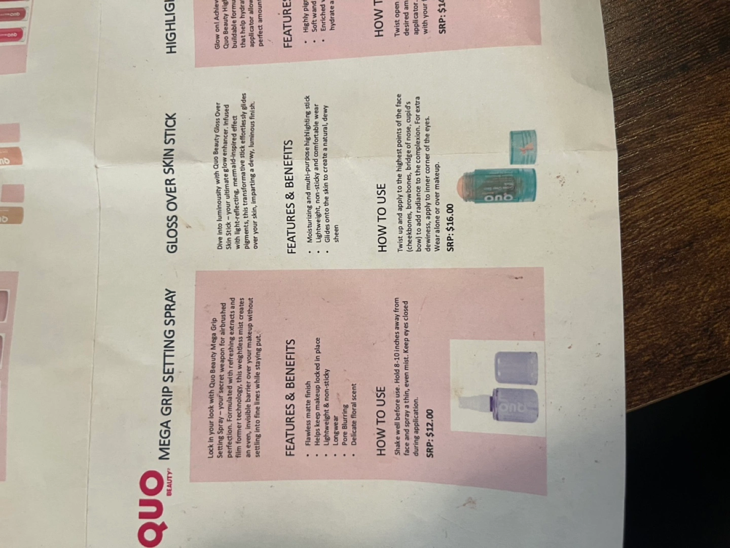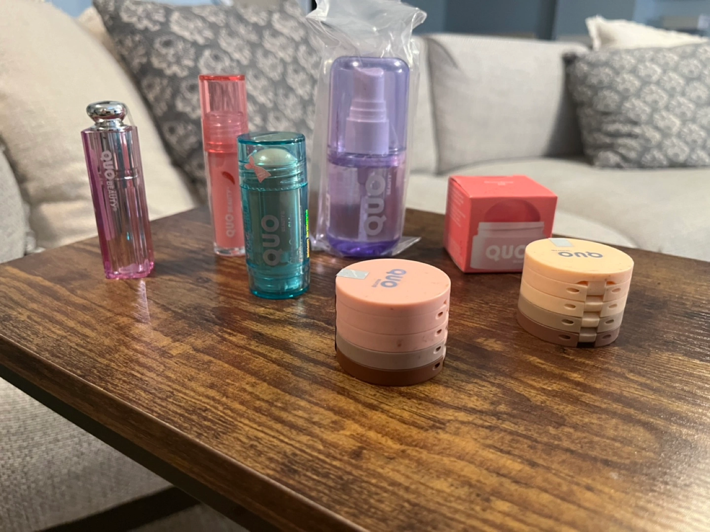 Various Quo Beauty makeup products. Includes lip balm, plumping lip oil, blush, eyeshadow, setting spray, and glass over skin stick. Never been used. Perfect for creating a full face of makeup.