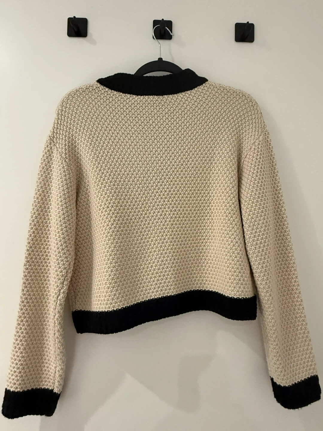 A lovely knit cardigan in beige with black trim! It has a classic, elegant look with pearl-like buttons and small pockets. Perfect for layering or wearing on its own. Wore less than 5 times.