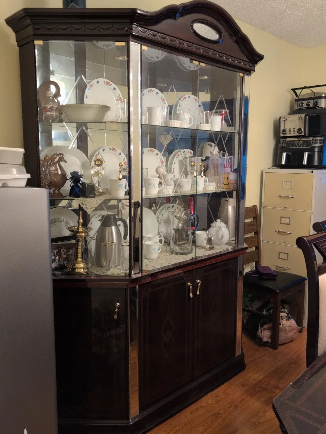 A beautiful dark wood china cabinet featuring mirrored doors and decorative trim. It has adjustable glass shelves and ample storage space in the lower cabinets. Perfect for displaying dishes, glassware, or collectibles!