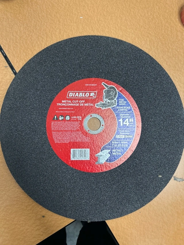 I'm offering a used Diablo metal cut-off wheel, 14 inch diameter with a 1 inch arbor. This abrasive wheel is designed for metal saws, providing efficient and clean cuts. Wheel shows signs of use but still has life left. Diameter: 14 inches. Arbor Size: 1 inch (25.4 mm). Thickness: 7/64 inch (3 mm). Max RPM: 4,350. Cash accepted.