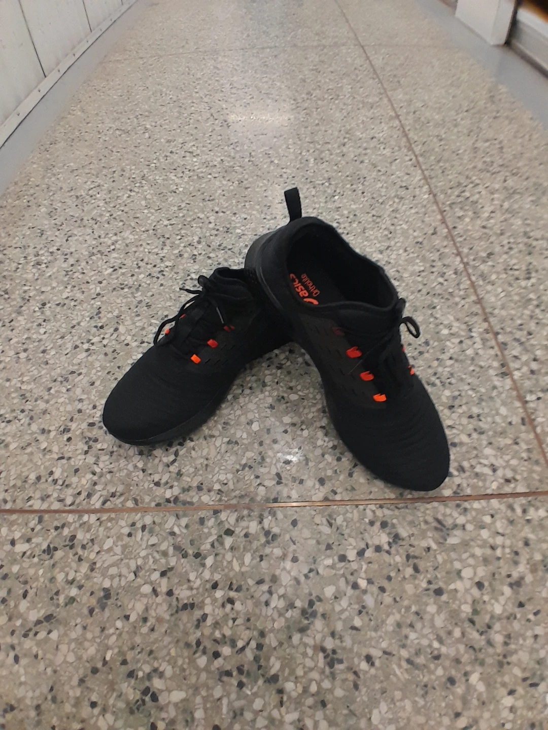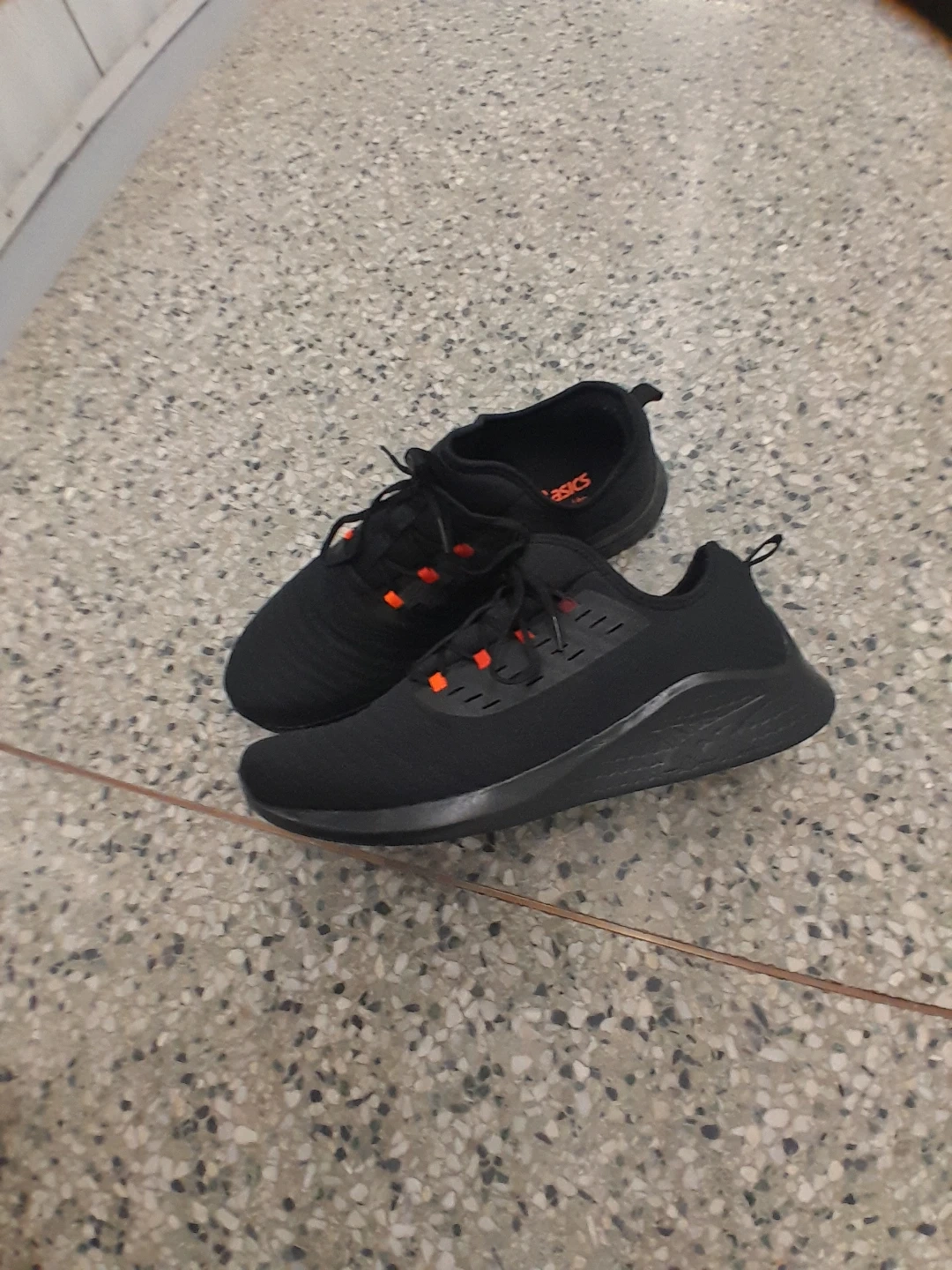 Original ASICS running shoes. They feature orange accents on the laces and eyelets. The shoes appear to be made of a breathable mesh material Men's size 14.