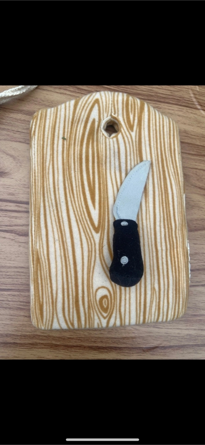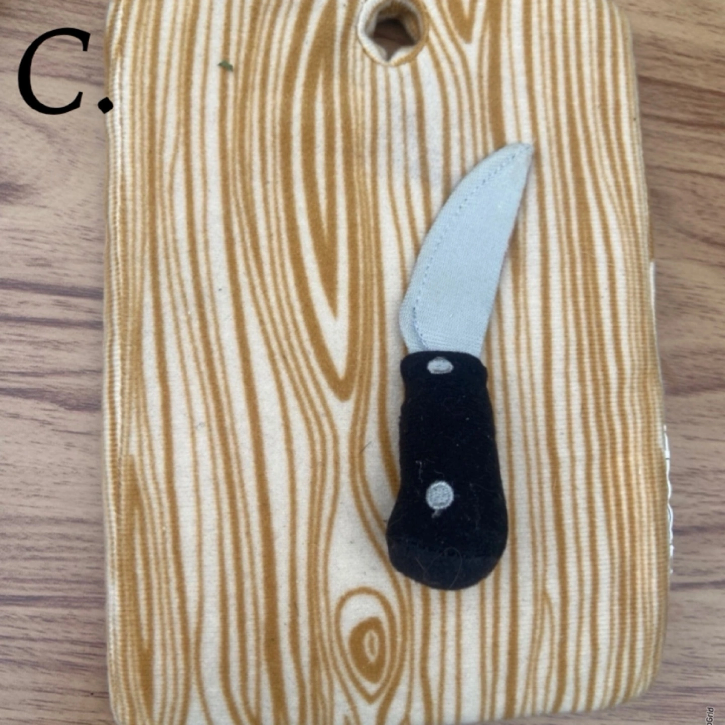 C. Add a touch of whimsy to your play kitchen with this adorable, gently used felt cutting board and knife set, perfect for imaginative culinary adventures!